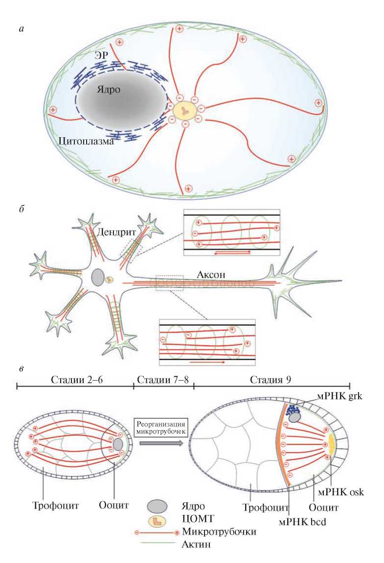 Рис. 1. Организация микротрубочек в различных типах клеток. Эукариотическая клетка – микротрубочки направлены от центра организации микротрубочек (ЦОМТ) к периферии клетки (а). Транспортная система микротрубочек в нейронах – в аксоне микротрубочки расположены в одной ориентации – к дистальному концу аксона; в дендритах – смешанная ориентация микротрубочек (б). Ооцит в процессе созревания – микротрубочки обеспечивают поляризацию ооцита и реорганизуются на различных стадиях (в). Актиновый цитоскелет обеспечивает клеточный каркас и участвует в закреплении “груза” в месте локализации. ЭР – эндоплазматический ретикулум. Полярность микротрубочек обозначена (+) или (–) (цитировано по [9, 11]).