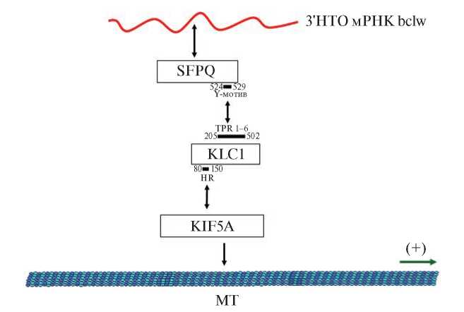 Рис. 4. Механизм взаимодействия мРНК bclw с SFPQ и кинезиновым моторным комплексом в сенсорных нейронах спинномозгового ганглия R. norvegicus. На схеме обозначена 3'-нетранслируемая область (3'-НТО) мРНК, адаптеры РНК, моторные белки и микротрубочки (МТ). Двусторонние стрелки показывают известные белок-белковые или РНК-белковые взаимодействия. Домены белков обозначены линиями черного цвета. Длина указана в аминокислотных остатках. Стрелка указывает направление движения моторного комплекса по микротрубочкам. TPR – тетратрикопептидный повтор, HR – гептапептидный повтор.