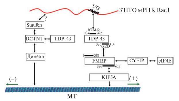 Недавно выявили колокализацию TDP-43 и мРНК-связывающих адаптеров FMRP и Staufen1/2 в дендритах нейронов мыши. По результатам микроскопического анализа и биохимических экспериментов предложена модель их кооперативного действия в регуляции транспорта специфического набора нейрональных мРНК (рис. 5).