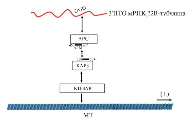 На данный момент показано участие APC в транспорте мРНК двумя моторными комплексами – кинезином-1 (KIF5) и кинезином-2 (KIF3) [18, 75]. APC функционирует в виде димера, в котором каждый мономер связывает одну молекулу мРНК [18]. В число мРНК, транспортируемых APC, входят аксональные мРНК β-актина и β2B-тубулина [76]. APC взаимодействует с субъединицей KAP3 кинезина-2 и таким образом рекрутирует мРНК [18] (рис. 6).