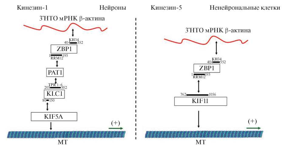 Предполагается, что потенциальным прямым адаптером между ZBP1 и кинезином-1 (KLC) в этом механизме служит белок PAT1 (Protein interacting with APP tail-1) [91]. Кинезин-1 не участвует в механизме транспорта мРНК β-актина в других типах клеток, он может быть специфичным участником нейронального транспорта. В других клетках движение мРНП-частицы ZBP1-β-актина по микротрубочкам опосредовано моторным комплексом кинезин-5 (KIF11) [17]. Нарушение активности кинезина-5, как и его нокдаун, вызывают аномалии в локализации мРНК β-актина. По данным экспериментов in vitro и in vivo С-концевой участок кинезина-5 прямо взаимодействует с RRM-доменами ZBP1 (RRM12). Этот же механизм действует в транспорте двух других ZBP1-зависимых мРНК – Arp16 и α-актинина [17, 92]. Таким образом, ZBP1 может быть общим адаптером для транспорта мРНК разными кинезиновыми моторными комплексами.