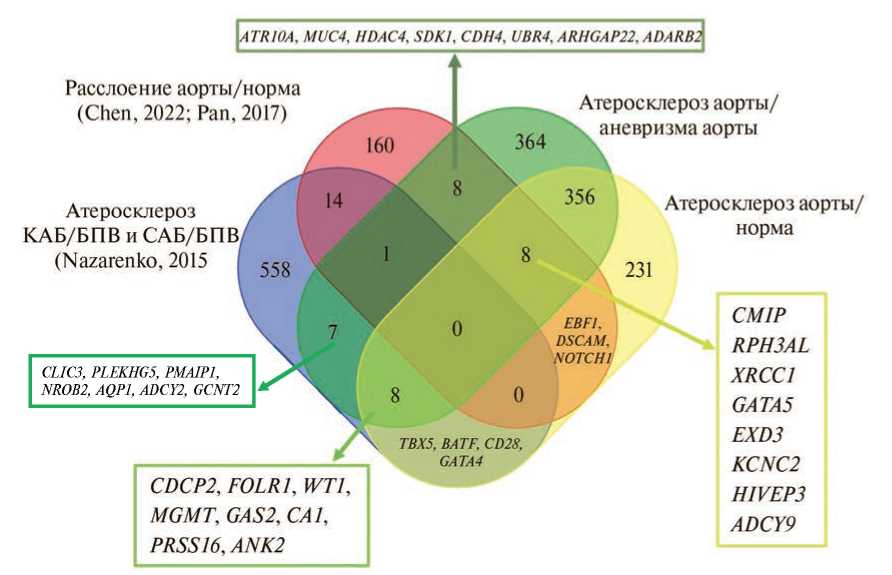 Рис. 1. Диаграмма Венна, показывающая общие ДМГ, выявленные в данной работе, при расслоении аорты относительно нормальной ткани аорты [13, 14], при атеросклерозе коронарных и сонных артерий относительно интактных сосудов [10, 23].