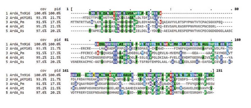 3. Fig. 1. Alignment of amino acid sequences encoded by the ardA genes of the conjugative plasmid pKM101, transposon Tn916, A. tumefaciens, P. monteilii and Xanthomonas sp. (-) – absence of homologous amino acid, Cov value shows the percentage coverage of each sequence, pid – content (%) of identical amino acids.