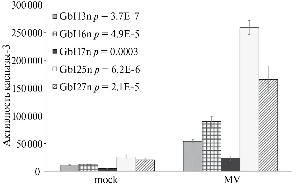 Выявлено значительное увеличение активности проапоптотической каспазы-3 во всех MV-инфицированных (p < 0.0005) клеточных линиях глиобластомы, включая Gbl17n, через 48 ч после заражения (рис. 2). Эти результаты показывают, что все клетки глиобластомы, включая Gbl17n, отвечают на заражение MV.