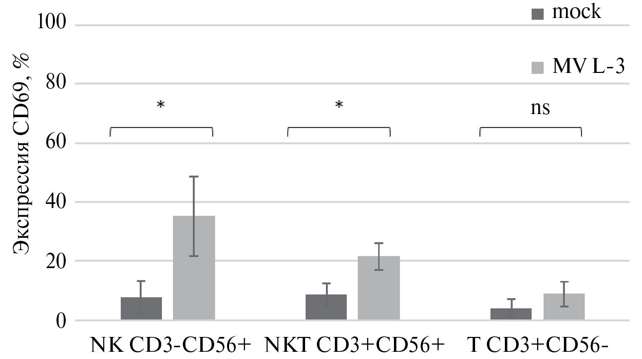 Рис. 6. Активация NK-клеток. Результаты проточной цитометрии клеток PBMC до и после индукции вирусом паротита (MV). Экспрессия СD69 (%) на поверхности CD3-CD56+ клеток. *р = 0.014; 0.027 и 0.122 соответственно.