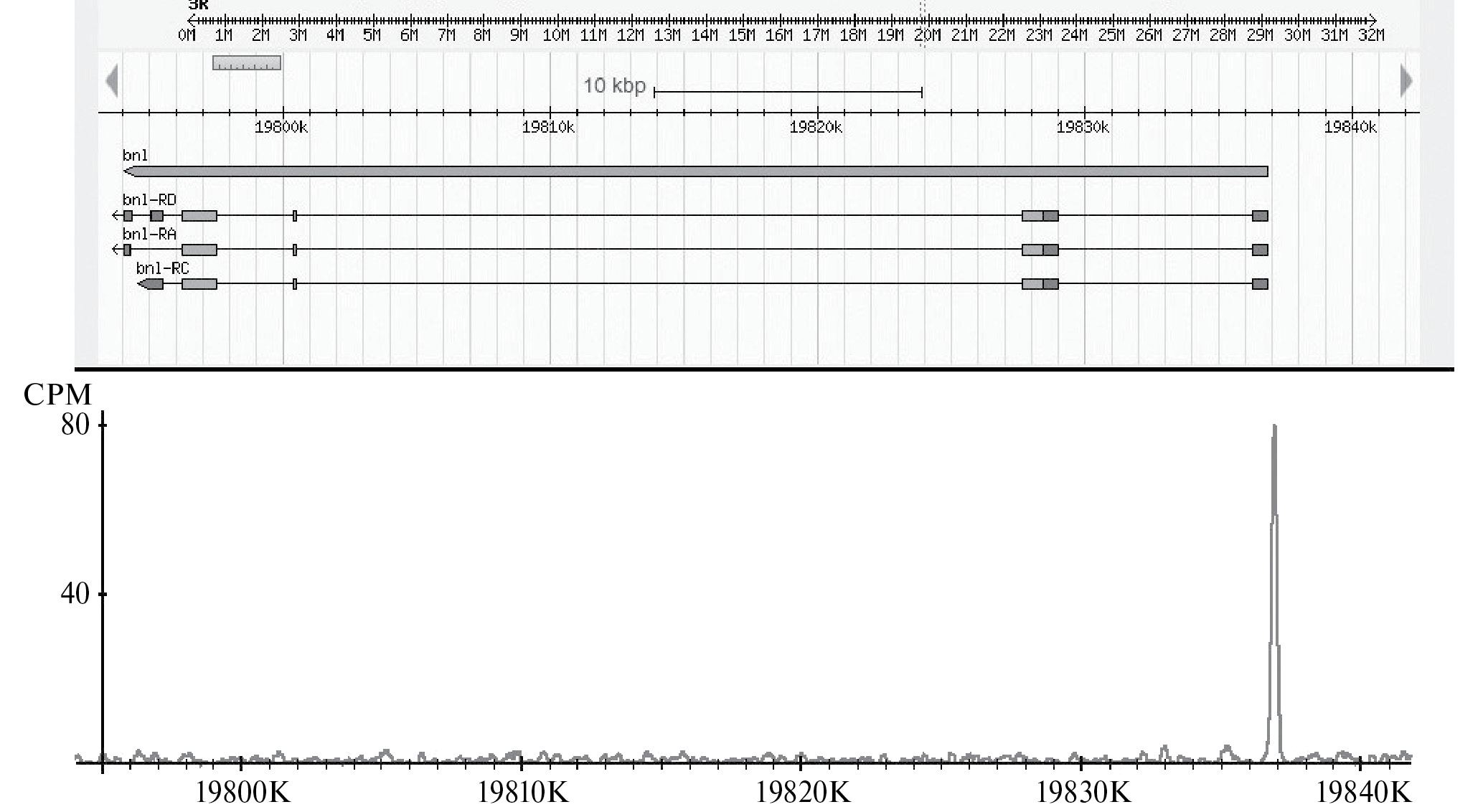 Рис. 2. ChIP-Seq профиль белка CG9609 в области гена bnl. На верхней панели представлена структура гена из геномного браузера. На нижней панели представлен сам ChIP-Seq профиль в единицах CPM. Видно, что белок CG9609 локализован на промоторе гена bnl.