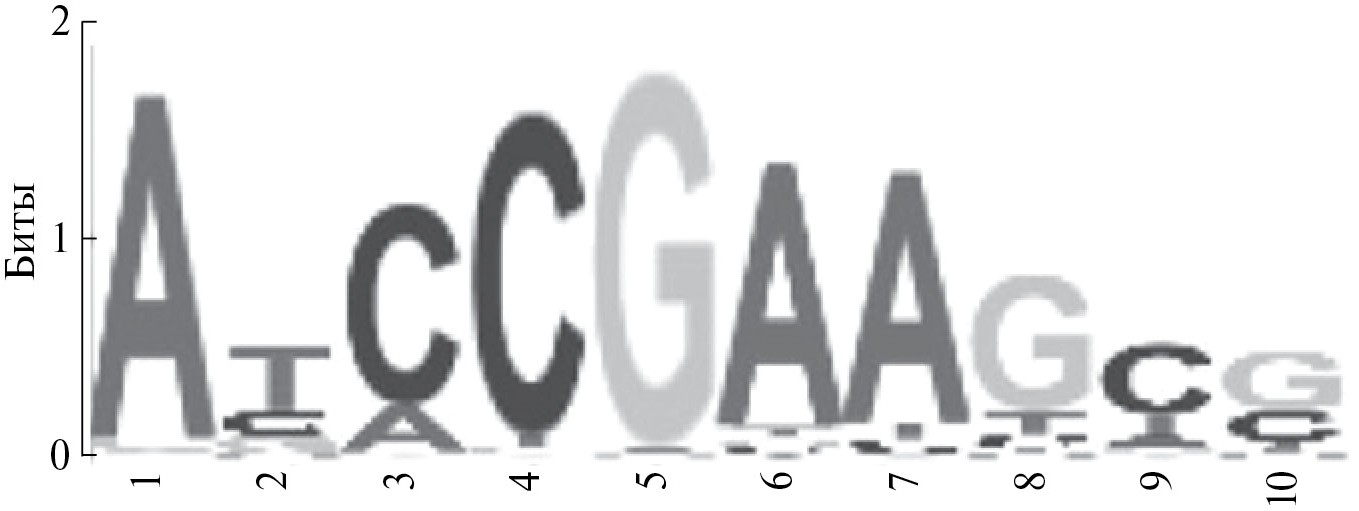 На рис. 3 представлена консенсусная последовательность, имеющая наибольшее обогащение во фрагментах ChIP-Seq. Эта консенсусная последовательность имеет высокую статистическую значимость, центральное обогащение в ChIP-Seq-фрагментах и не является сайтом связывания какого-либо известного белка. Эту последовательность можно рассматривать как потенциальный сайт связывания белка CG9609.