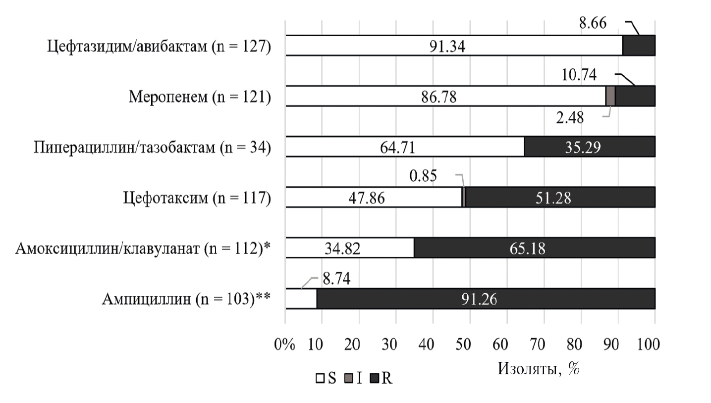 Рис. 2. Чувствительность к антибактериальным препаратам Enterobacterales, выделенных в хирургических отделениях. Обозначения: *среди них идентифицировано 17 изолятов, продуцирующих хромосомные цефалоспориназы AmpC (E. cloacae complex – 13, M. morganii – 2, K. aerogenes – 1, H. alvei – 1); **среди них ‒ 52 изолята, продуцирующих хромосомные цефалоспориназы AmpC и β-лактамазы широкого спектра (K. pneumoniae – 33, E. cloacae complex – 13, M. morganii – 2, K. aerogenes – 1, K. oxytoca – 1, H. alvei – 1, C. koseri – 1).