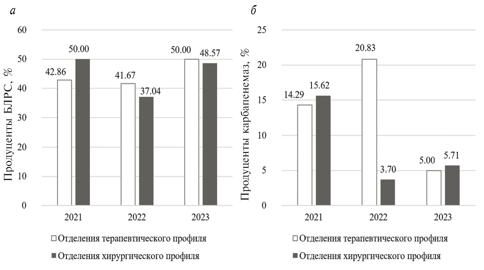 Рис. 4. Динамика изменения доли продуцентов БЛРС (а) и карбапенемаз (б) среди Enterobacterales, выделенных от госпитализированных пациентов, за 2021‒2023 гг.