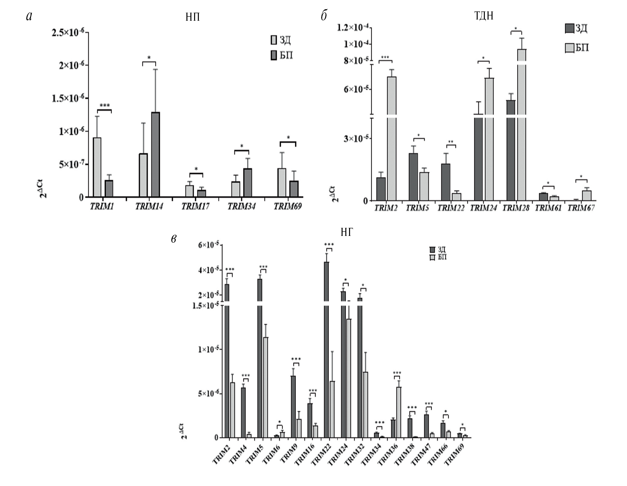 Рис. 1. ПЦР-анализ экспрессии генов семейства TRIM в НП (а), ТДН (б) и НГ (в) здоровых доноров (ЗД) и пациентов с БП (БП). *р < 0.05, **р < 0.01, ***р < 0.001. В качестве референсного гена использовали ген 18S рРНК.