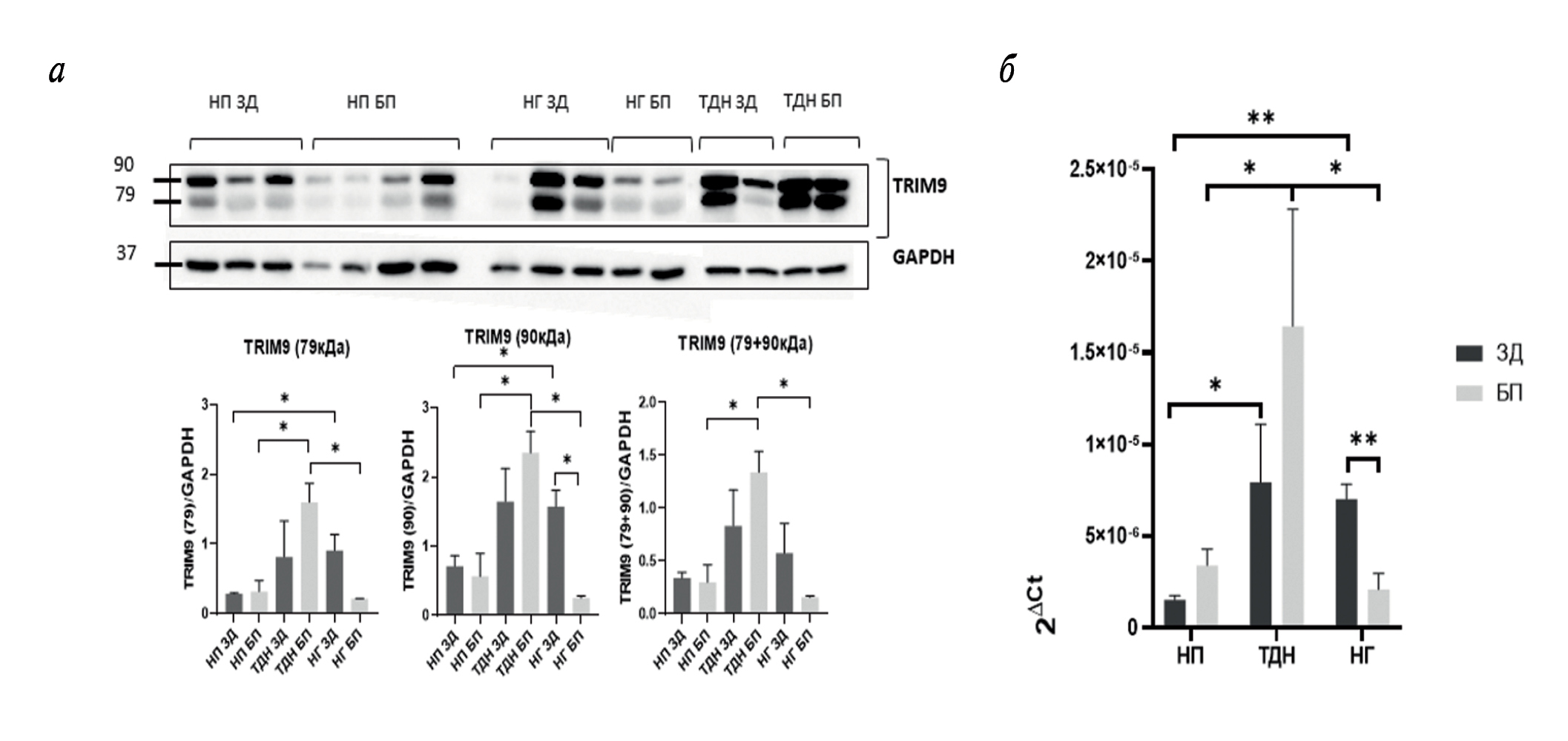 По нашим данным, во всех исследованных нами типах клеток белок TRIM9 представлен двумя изоформами – 79 и 90 кДа (что соответствует базе данных Uniprot) (рис. 2а). При этом наблюдалось увеличение количества обеих изоформ этого белка в ТДН пациентов с БП по сравнению с НП и НГ, что в целом согласуется с результатами анализа транскрипции гена TRIM9 (рис. 2б). В ТДН пациентов с БП наблюдается тенденция к увеличению экспрессии гена и белка TRIM9 по сравнению с контролем, в то время как в НГ пациентов с БП, напротив, уровень мРНК и белка TRIM9 снижался.