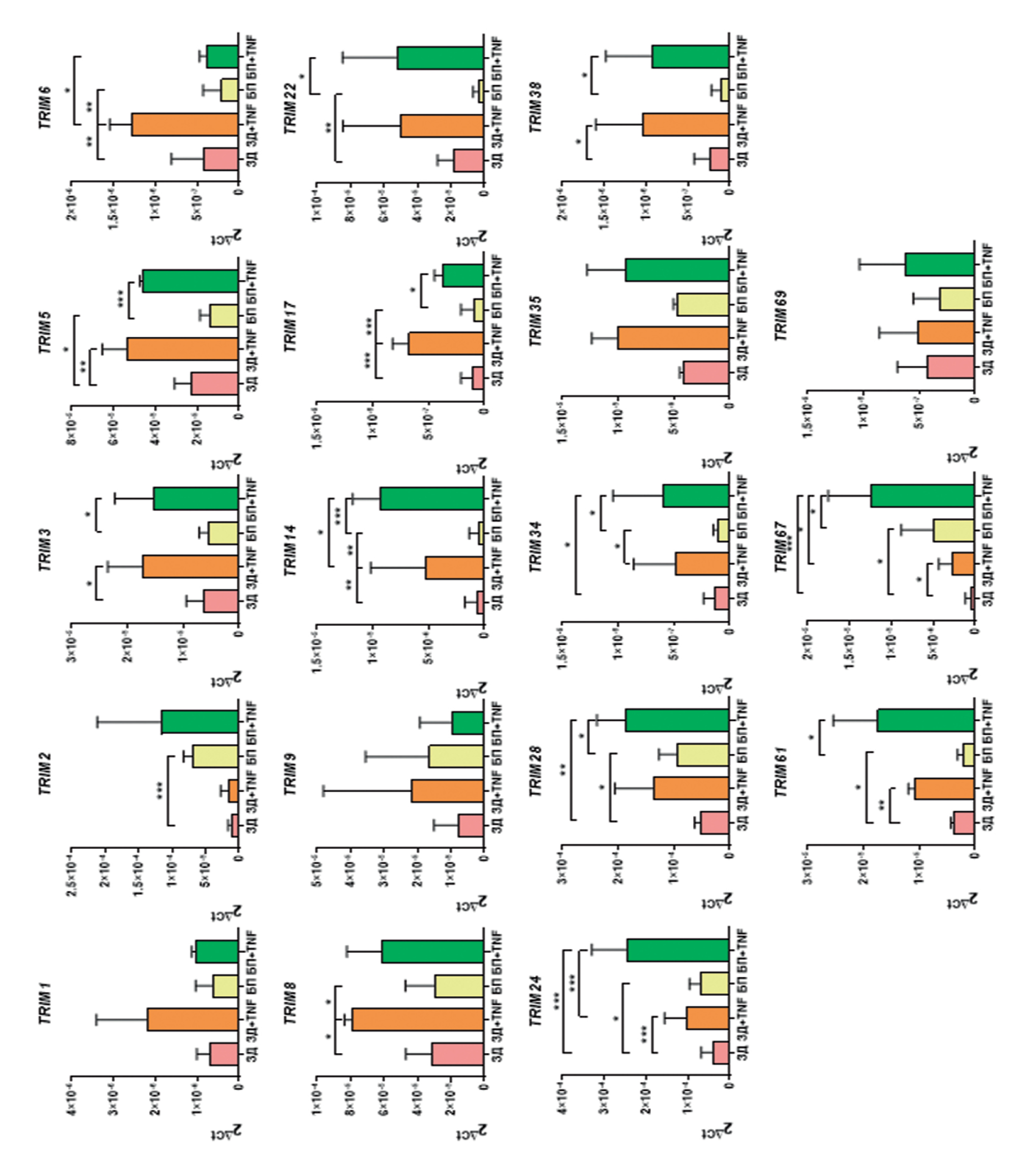 При индукции воспаления с помощью TNFα в НГ экспрессия многих генов TRIM остается пониженной в клетках пациентов с БП по сравнению с клетками здоровых доноров или еще более снижается. В контексте упомянутых выше данных можно говорить о роли отдельных TRIM в изменении воспалительного ответа в глиальных клеточных линиях, полученных от пациентов с БП, который может оказывать патологическое действие на нейроны, соседствующие с глиальными клетками в мозге.