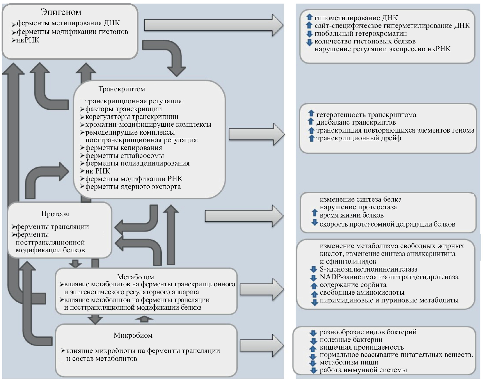 Рис. 1. Согласованная мультиомиксная регуляция в процессе старения.