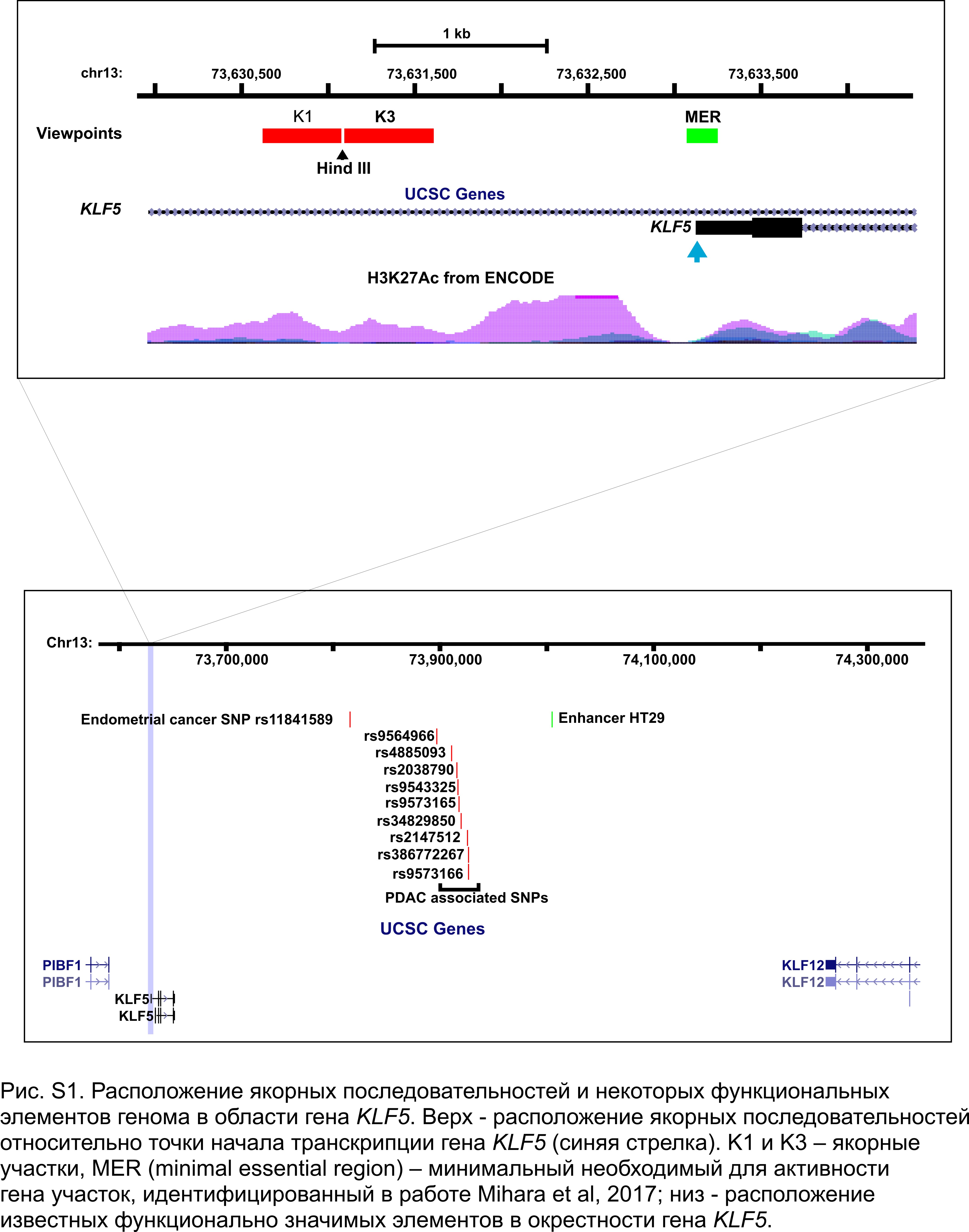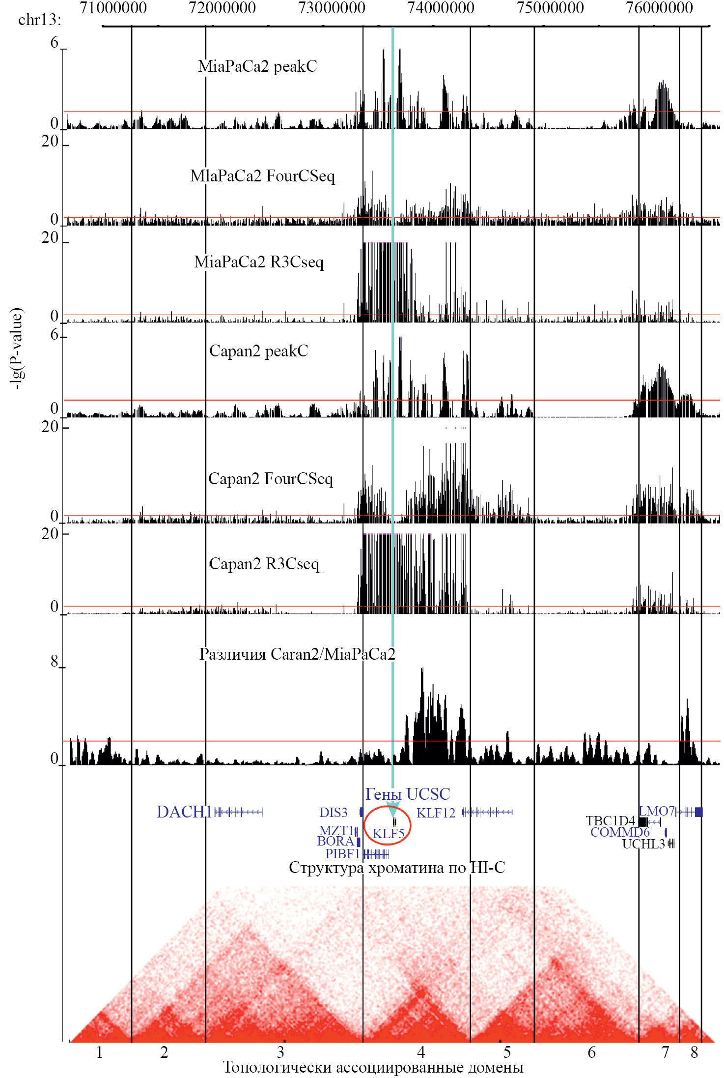 Специфичная для клеток Capan2 область длиной около 40 т.п.н. содержит группу SNP, ассоциированных с PDAC (рассмотрена выше). Кроме того, для Capan2 специфичны две области контакта со свойствами промотора. Одна из них (74709920–74715862) расположена вблизи точки начала транскрипции KLF12, другая – во втором интроне (и вблизи точки начала транскрипции) UCHL3. При этом KLF5 экспрессируется преимущественно в Capan2, а UCHL3 – в обеих линиях клеток. Также для Capan2 специфичны сайт связывания фактора транскрипции CTCF (потенциальный инсулятор) в интроне 7 гена KLF12 и две области контакта со свойствами энхансера, расположенные в интроне 1 гена TBC1D4 и интроне 5 гена LMO7. Эти два элемента можно рассматривать как кандидаты на роль энхансера KLF5 в этих клетках.