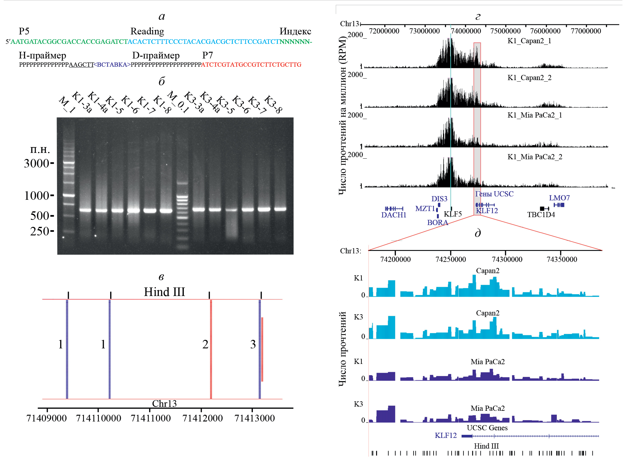 Рис. 1. Структура и секвенирование библиотек. а – Структура библиотек. P5, P7, Reading – последовательности для секвенирования Illumina; H- и D-праймеры – уникальные праймеры для обращенной ПЦР со стороны сайтов Hind III и Dpn II соответственно; индекс – индексные последовательности; вставка – амплифицированная геномная последовательность, контактирующая с якорем. б – Электрофорез в агарозном геле 4С библиотек после второго этапа ПЦР-амплификации. Номер библиотеки соответствует номеру праймера Hind III (см. табл. 1). M_1 и M_0.1 – ДНК-маркеры 1 и 0.1 т.п.н. соответственно. в – Типичное расположение прочтений относительно сайтов расщепления Hind III в участке хромосомы 13. Представлены три варианта лигирования: (1) по одной из цепей; (2) по противоположной цепи; (3) по обеим цепям с разной эффективностью. Рисунок подготовлен при помощи пакета SeqMonk (https://www.bioinformatics.babraham.ac.uk/projects/seqmonk). г – Расположение контактных участков в области хромосомы 13 длиной 6 млн.п.н. вокруг гена KLF5. По оси ординат отложено число прочтений на миллион (RPM) в соответствующей библиотеке, синяя вертикальная линия показывает положение якорных последовательностей. В двух верхних дорожках показано распределение контактов якорной последовательности K1 и клеток Capan2 в двух независимых экспериментах; в следующих двух дорожках – те же данные для клеток MIA PaCa2. д – Pасположение контактных участков в небольшой (200 т.п.н.) области хромосомы 13 вблизи гена KLF12. По оси ординат отложено число прочтений в соответствующей библиотеке. Две верхние дорожки позволяют сравнить распределение контактов якорных последовательностей K1 и K3 в клетках Capan2, следующие две дорожки – то же для клеток MIA PaCa2. Внизу показано расположение сайтов расщепления Hind III.
