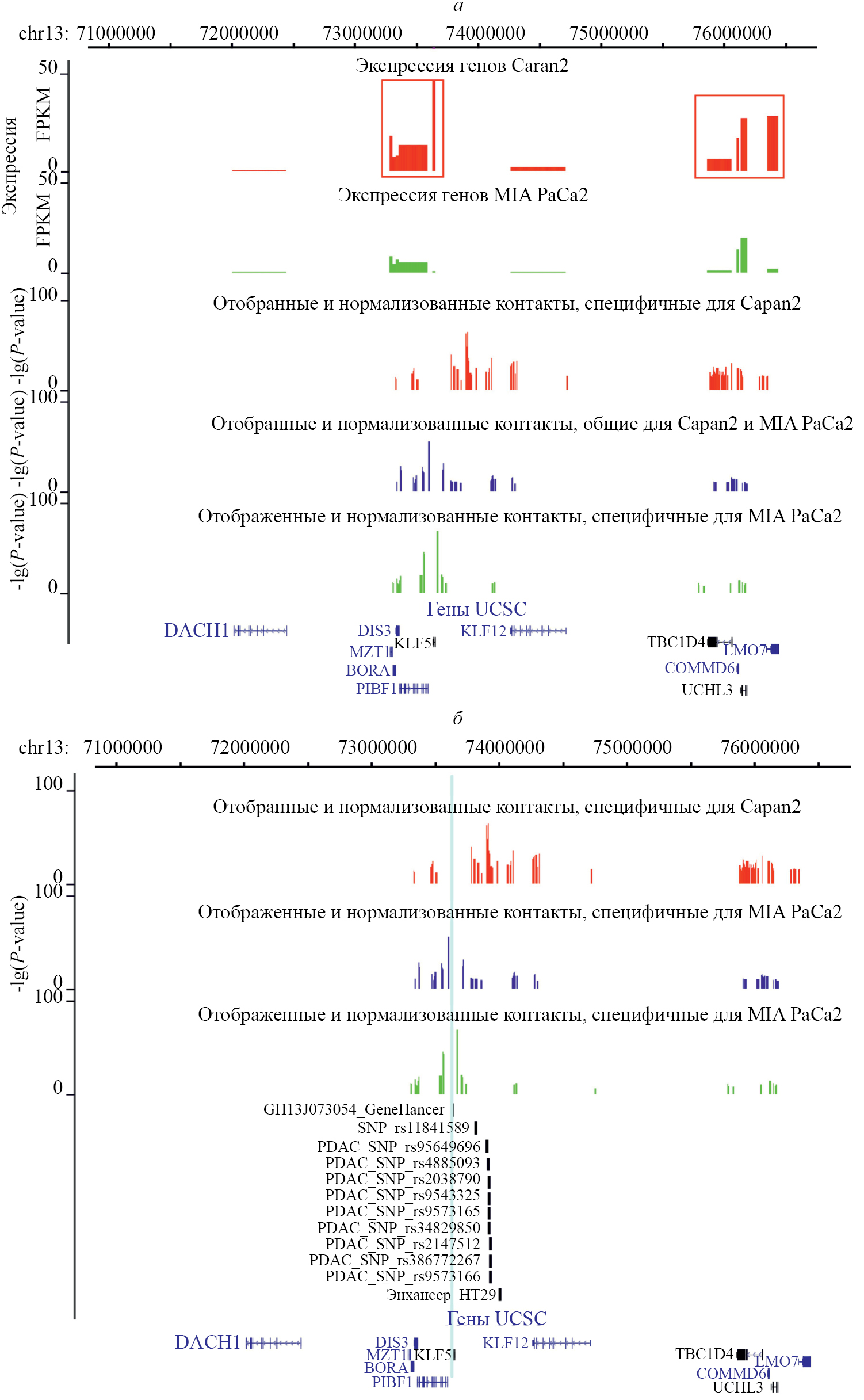 Рис. 3. Расположение отобранных и нормализованных участков контакта якорного участка гена KLF5 в области хромосомы 13 человека размером 6 млн п.н. относительно некоторых функциональных элементов. Отдельно приведены области контактов, специфичные для клеток Capan2, MIA PaCa2, и общие для обеих линий клеток. а – Тканеспецифичность экспрессии генов в клетках Capan2 и MIA PaCa2, связь уровня экспрессии гена и числа его контактов с промоторной областью KLF5. По осям ординат отложены значения FPKM для оценки уровня экспрессии генов и –lg(P-value) для участков контакта. б – Расположение относительно контактов точек однонуклеотидного полиморфизма и делеций/вставок (SNP/indel), ассоциированных с PDAC по данным полногеномного анализа (GWAS, Genome-Wide Association Studies, см. [11, 13]).