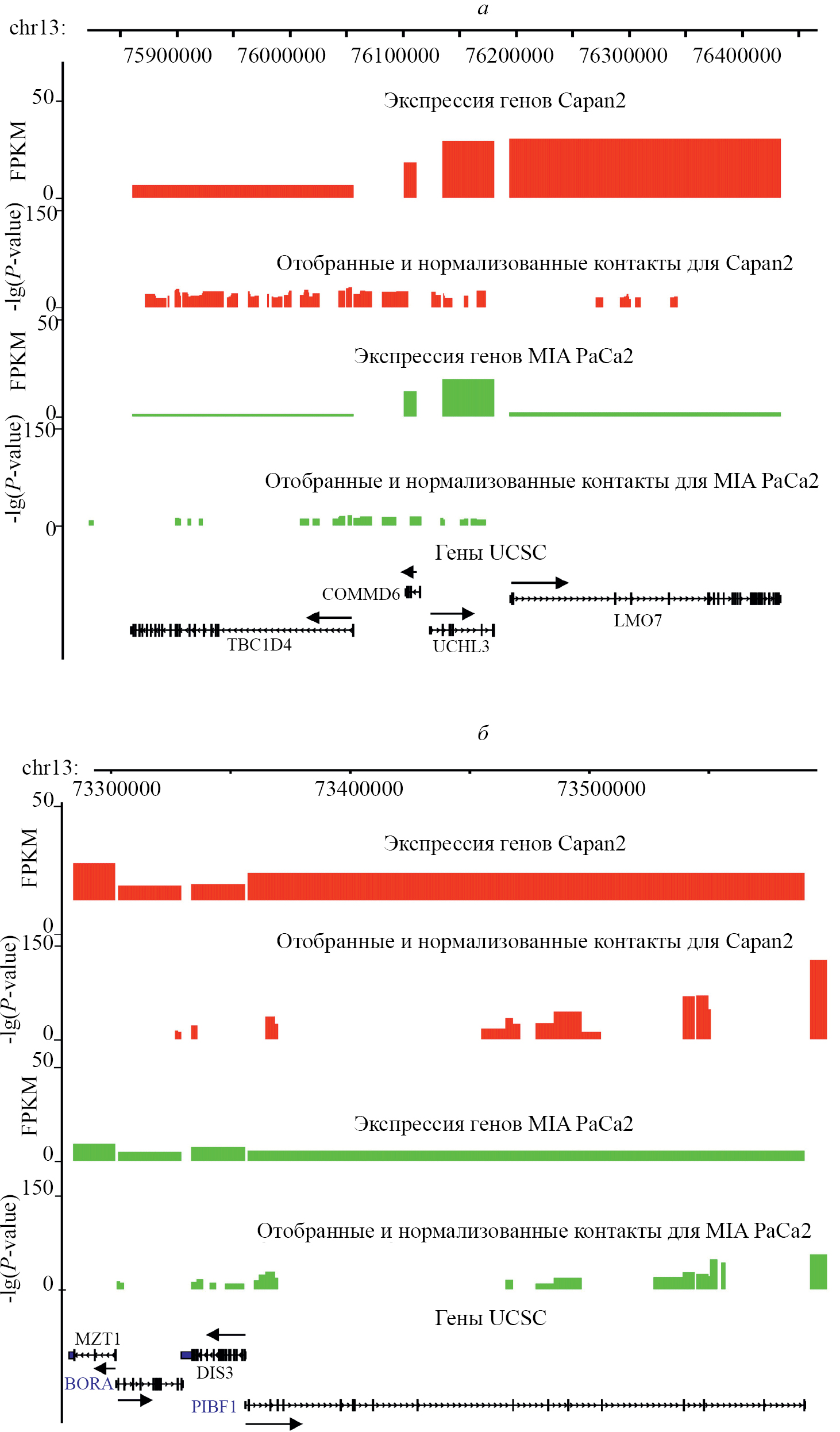 Верно ли это предположение для других генов? На рис. 4 представлены в более крупном масштабе два кластера по четыре гена в каждом. На рис. 4а видно, что гены, экспрессия которых в клетках Capan2 заметно выше, чем в MIA PaCa2, характеризуются значительно бóльшим числом колокализованных контактов, специфичных для Capan2. В частности, контакты, специфичные для MIA PaCa2, полностью отсутствуют в области гена LMO7. Если же ген экспрессируется в обеих линиях на сходном уровне (COMMD6, UCHL3), то и число локализованных контактов для них близко. Более сложная картина наблюдается в другом кластере генов (рис. 4б). Если в случае гена PIBF1 приведенное выше правило выполняется – ген экспрессируется в обеих линиях клеток и содержит близкое число контактов как в Capan2, так и в MIA PaCa2, то подобная картина не наблюдается у трех других генов. В целом, однако, предложенное правило выполняется для семи из 10 генов.