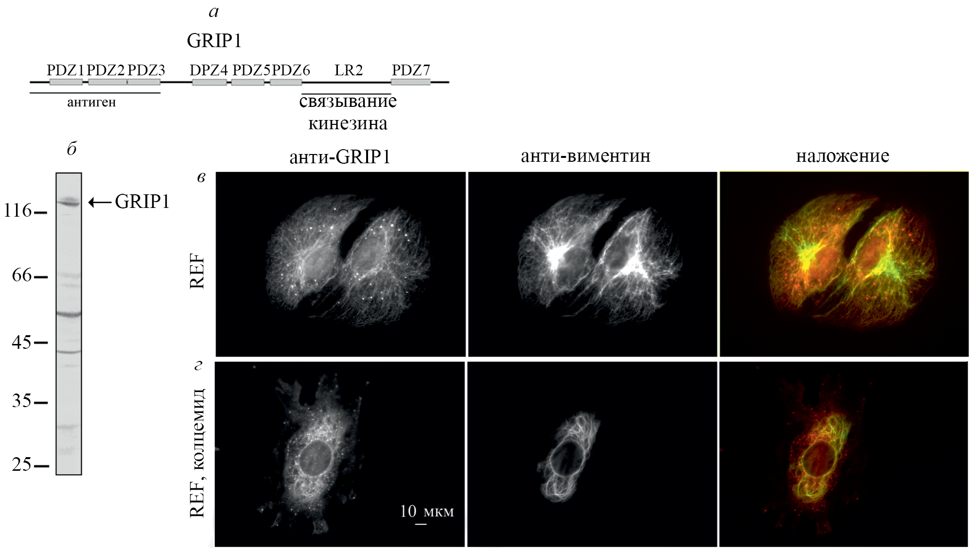 Рис. 1. Характеристика анти-GRIP1-антител с использованием иммуноблотинга и иммунофлуоресцентного окрашивания. а – Схема строения молекулы GRIP1. б – Результат иммуноблотинга гомогената фибробластов крысы REF52 с анти-GRIP1-антителами. в – Клетки REF52, обработанные одновременно анти-GRIP1 и анти-виментиновыми антителами. г – Такое же окрашивание клеток REF52, предварительно обработанных колцемидом до полной деполимеризации микротрубочек. Масштаб 10 мкм на всех изображениях.