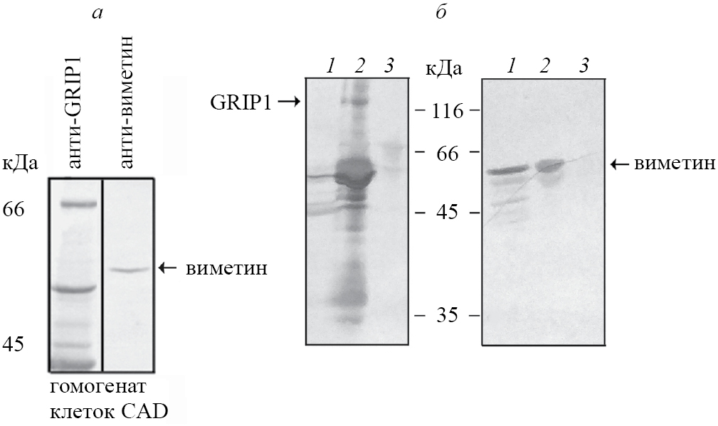 Рис. 2. Антитела к GRIP1 не взаимодействуют с виментином, но преципитируют его из клеточного экстракта. а – Два одинаковых иммуноблота с гомогенатом клеток CAD, параллельно обработанных антителами к GRIP1 и виментину. б – GRIP1 преципитирован из экстракта (1) клеток REF52; анти-GRIP1-преципитат (2) содержал виментин, в отличие от контрольного (3), полученного инкубацией такой же порции клеточного экстракта с чистыми агарозными гранулами с привязанным белком A.