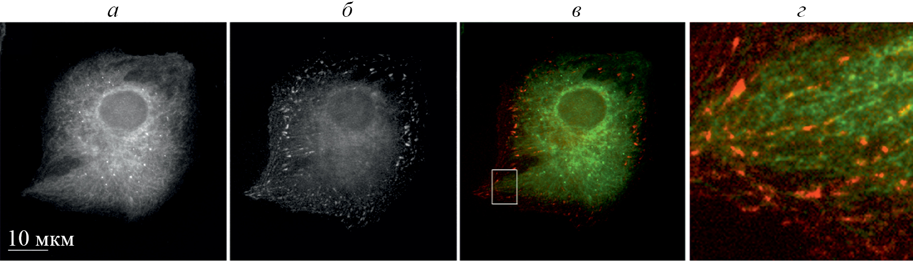 Рис. 7. GRIP1 и фокальные контакты (ФК) колокализуются на периферии фибробласта. Взаимное расположение филаментов, декорированных анти-GRIP1-антителами (а), и ФК (б) в фибробласте REF52. ФК визуализированы по экспрессии плазмиды, кодирующей зиксин человека, слитый с флуоресцирующим белком mKate. Последнее изображение (г) является увеличенным участком, выделенным на совмещенном изображении (в).