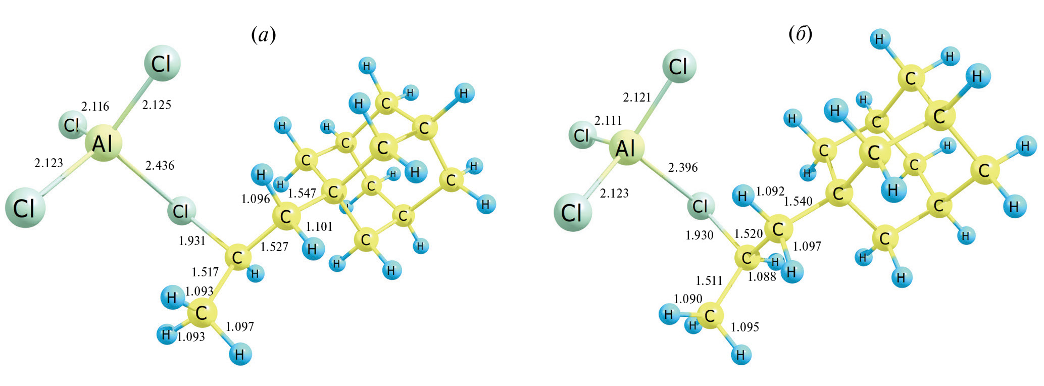 Рис. 1. Геометрическая структура Ad–CH2–CH+(AlCl4–)–CH3 в приближениях: (а) – B3LYP/6-31G*; (б) – B3LYP-D3(BJ)/6-311++G**.