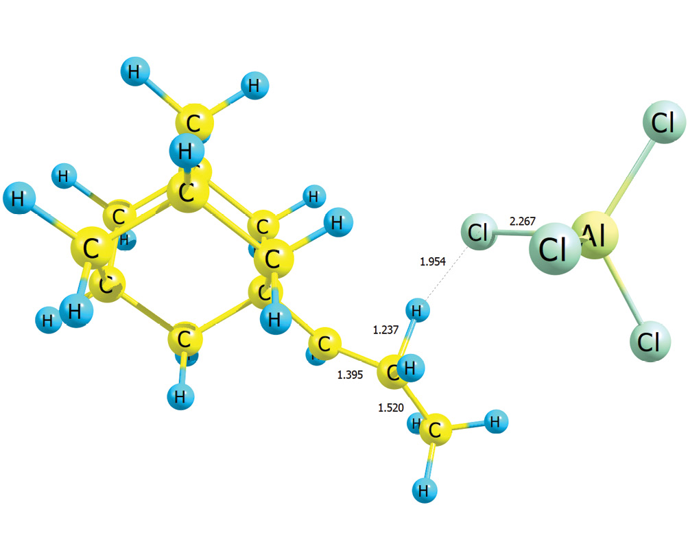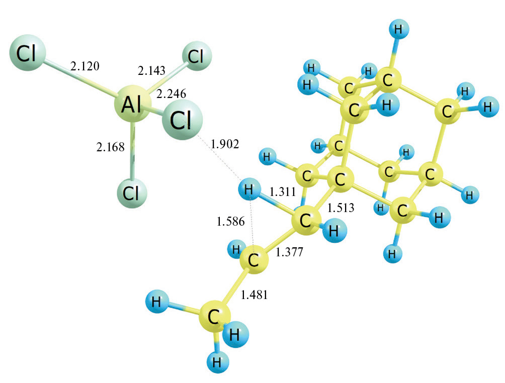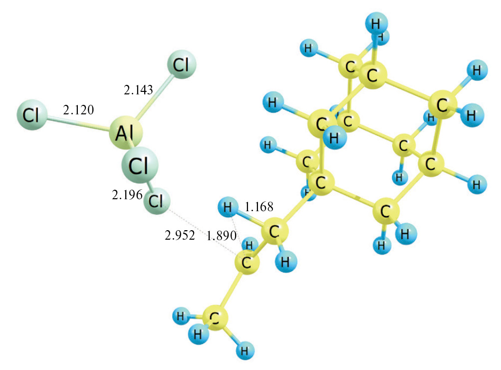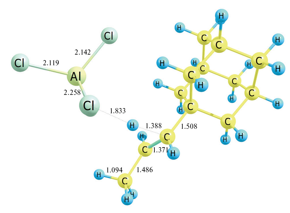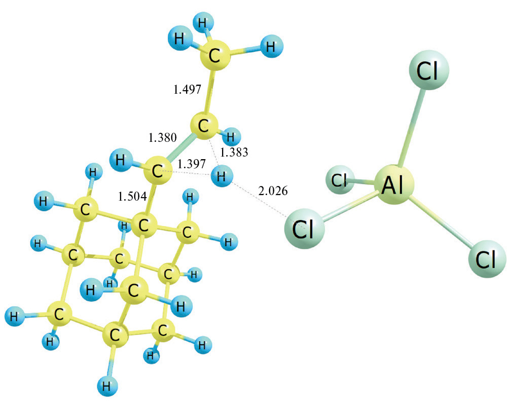 Энергия Гиббса распада Ad–CH2–CH+–CH3•AlCl4– на пропениладамантан и катализатор (реакция 10): Ad–CH2–CH+–CH3•AlCl4– → → Ad–CH=CH–CH3 (транс) + AlCl3•HCl составляет при 0 K ΔE0 = 16.5 ккал/моль, ΔE0≠ = 0.04 ккал/моль, при 298 K ΔG298 = 2.3 ккал/моль. Переходное состояние данной реакции представлено на рис. 7. Учет термических поправок приводит к ситуации, когда энергия Гиббса переходного состояния ниже соответствующего значения реагента, что позволяет считать, что процесс проходит практически без затрат энергии.