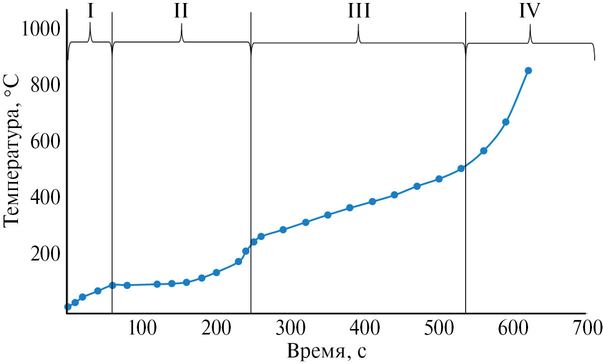 В качестве газа-элюента для пиролиза лигнина использовали аргон (осч. ч.). Гидролизный лигнин получен от ООО „Кировский биохимический завод“, Россия. С целью формирования кластеров железа на поверхности лигнина был использован нитрат железа(III) Fe(NO3)3‧9H2O („Ленреактив“, Россия). Нанесение нитрата железа на лигнин осуществляли методом пропитки по влагоемкости из водных растворов таким образом, чтобы концентрация железа в лигнине составляла 0.5 мас.%. После пропитки лигнина раствором нитрата железа с заданной концентрацией влажный лигнин помещали непосредственно в реактор и облучали микроволнами. Кривая изменения температуры реакционной зоны при воздействии на лигнин, пропитанный нитратом железа, микроволнового излучения, представлена на рис. 2. На этом рисунке можно выделить четыре стадии протекания процесса: I – нагрев лигнина, пропитанного водным раствором нитрата железа(III) до температуры кипения воды; II – испарение воды, разложение нитрата железа(III) и нагрев лигнина до температуры крекинга; III – крекинг лигнина с выделением водорода, легких углеводородов и пиролизного масла; IV – прекращение выделения пиролизного масла и резкое возрастание температуры.