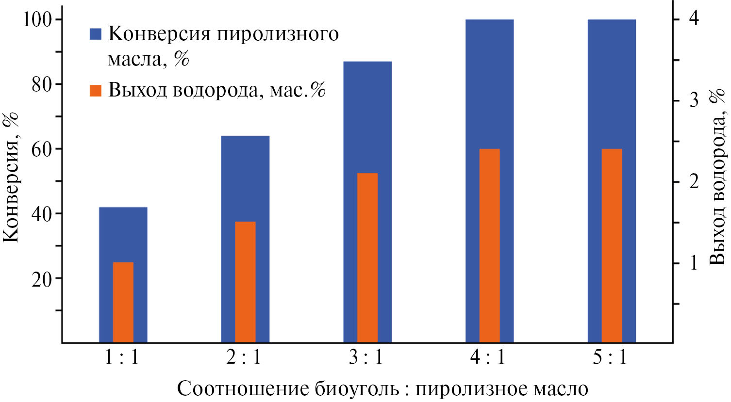 Рис. 7. Зависимость конверсии пиролизного масла и выхода водорода от массового соотношения загружаемых в реактор биоугля и пиролизного масла
