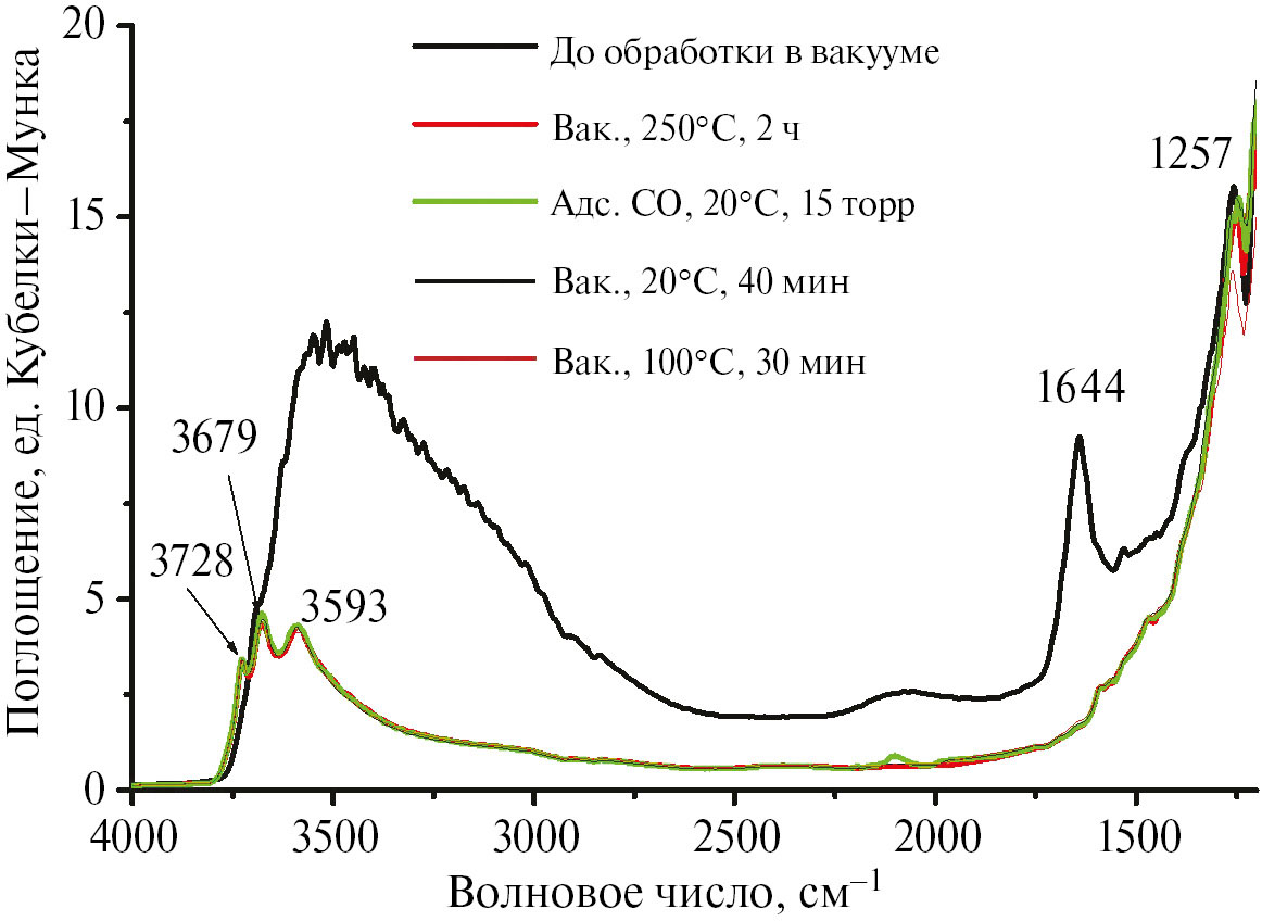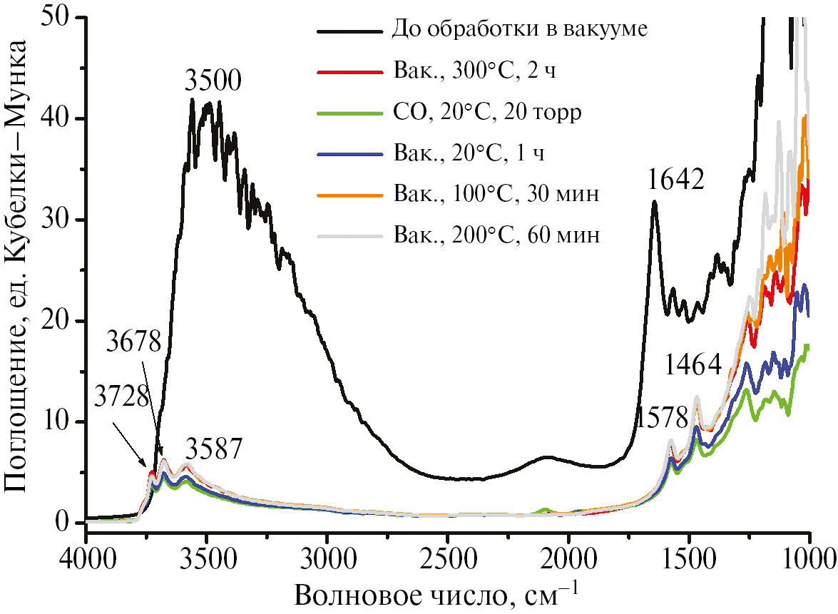 На рис. 10 представлены спектры катализатора в диапазоне 4000–1000 см–1, зарегистрированные до обработки в вакууме (as received), после вакуумирования при 300оС в течение 2 ч, адсорбции СО и десорбции CO при разных температурах. После всех обработок цвет катализатора не изменился.