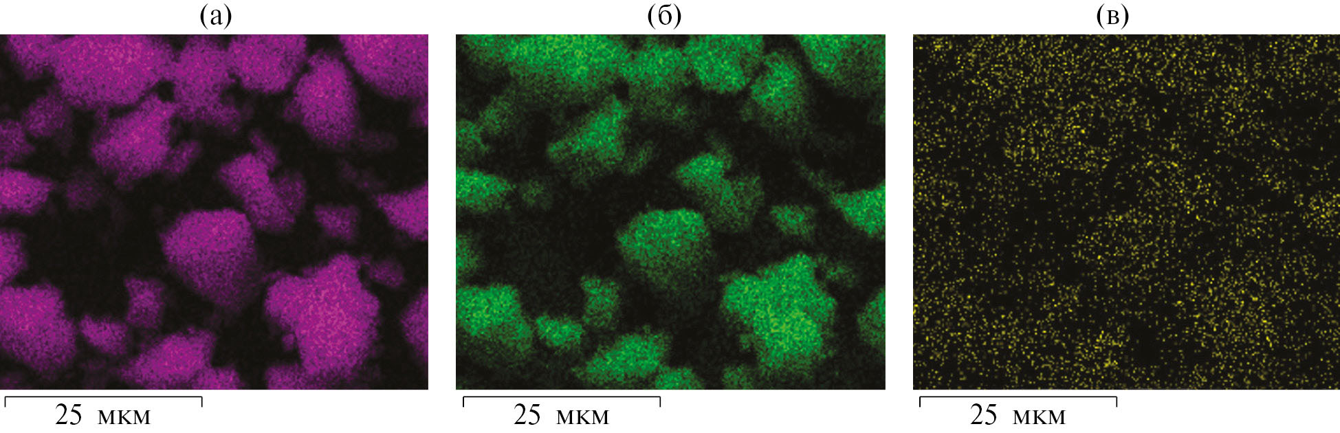 На рис. 6 представлены карты распределения элементов, полученные методом рентгеновского микроанализа (EDS-SEM). Показано, что в 0.3% Pd/γ-Al2O3(DMGO) содержатся элементы: алюминий (рис. 6а), кислород (рис. 6б) и палладий (рис. 6в). По данным EDS содержание палладия составляет 0.3 мас.%.