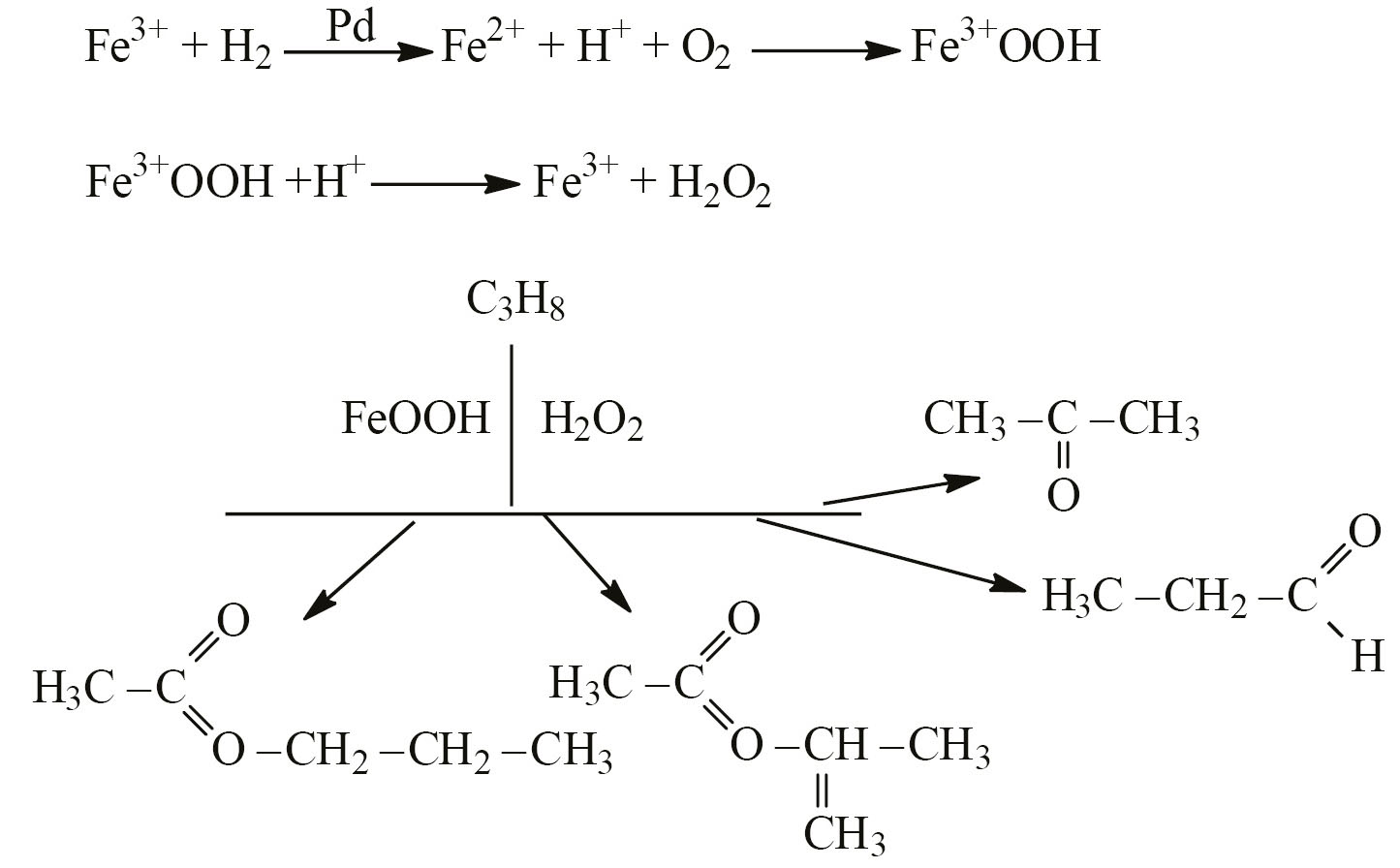 Каталитическая активность образцов 0.3% Pd/γ-Al2O3(DMGO) была изучена в реакции парциального окисления пропана молекулярным кислородом. Поскольку молекулярный кислород инертен в мягких условиях, мы вводили в систему водород в качестве совосстановителя для превращения кислорода в двухэлектронные окислители – пероксид водорода или его эквиваленты. Сульфат железа вводится в качестве сокатализатора, который в восстановленной форме взаимодействует с кислородом. Предполагаемая схема каталитического цикла представлена на рис. 7.
