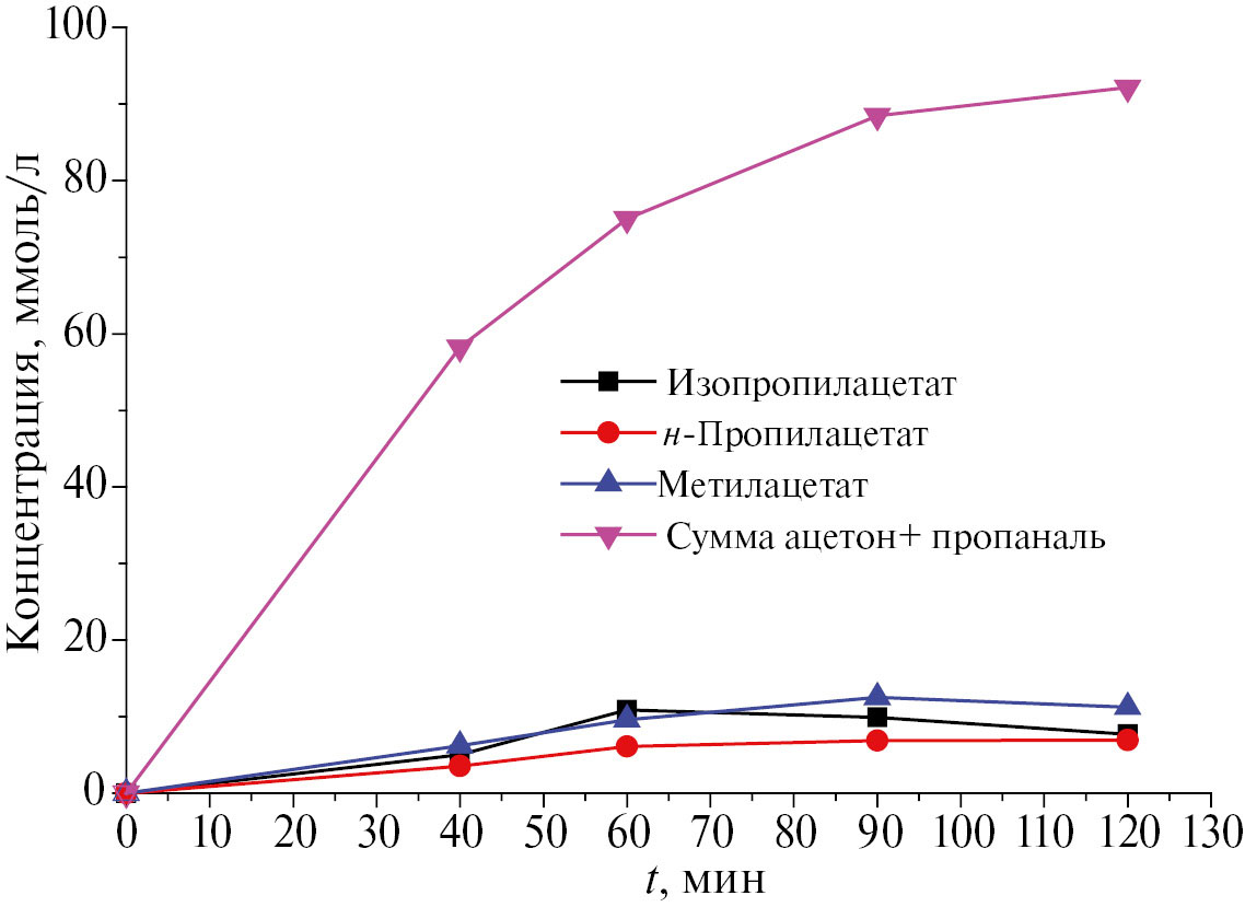 Продукты реакции парциального окисления – изопропилацетат, н-пропилацетат, метилацетат и смесь пропаналя с ацетоном; из рисунка видно, что при окислении пропана кислородом в присутствии водорода основные продукты реакции – ацетон и пропаналь.