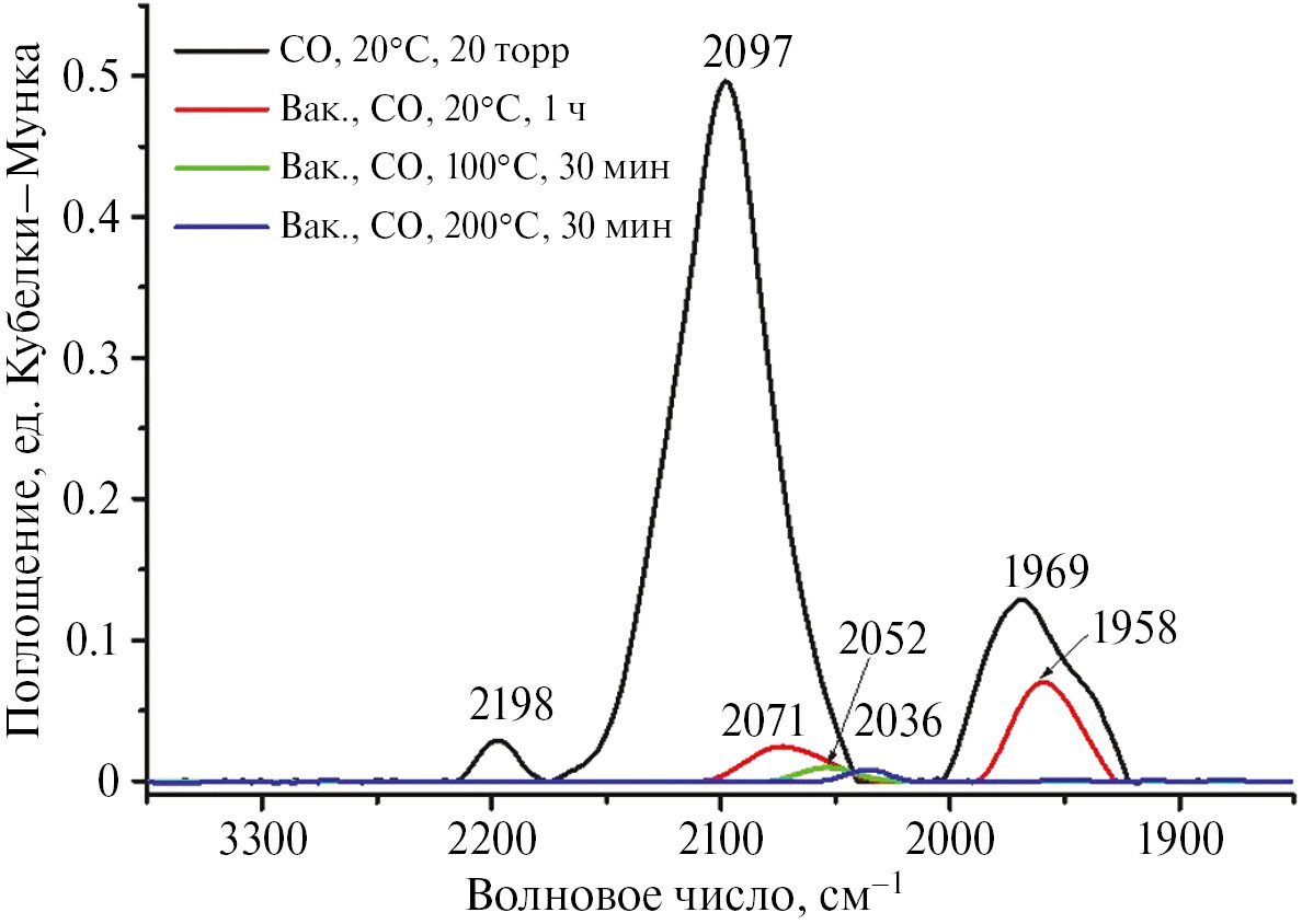 На рис. 3 в спектре исходного катализатора видна интенсивная широкая полоса при 3700–2700 см–1, в состав которой дали вклад: валентные колебания О–Н-связи гидроксильных групп Al2O3 и C4H8N2O2, а также валентных колебаний C–H-, C–C- и N–H-связей. Кроме того, в спектре присутствуют полоса валентных колебаний двойной связи С=N (1644 см–1) и полоса валентных колебаний N–OH-связи (1257 см–1) [35, 36]. Присутствие этих полос указывает на то, что диметилглиоксим полностью не удаляется с поверхности образца в процессе прокаливания и восстановления. Обработка исходного образца в вакууме при 250оС приводит к удалению остатков DMGO и растворителей с поверхности образца. При этом в спектре видны типичные для γ-Al2O3 полосы валентных колебаний ОН-групп при 3728, 3679 и 3593 см–1 [31, 32, 37]. На рис. 4 представлены DRIFT-CO спектры, зарегистрированные в процессе адсорбции–десорбции СО.