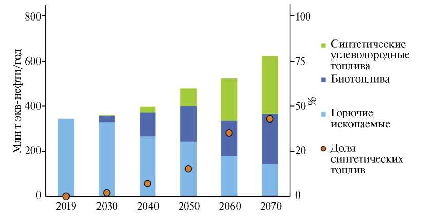 Развитие отрасли получения экологически безопасных топлив связано прежде всего с развитием направления декарбонизации, которое включает в себя разработку мероприятий и реализацию мер по снижению углеродного следа авиационной отрасли и воздействия выбросов СО2 на изменение климата. Программы по регулированию использования биотоплив в транспортном секторе приняты в ряде стран, например в США – Renewable Fuel Standard (RFS)2, в Европейском Союзе – Renewable Energy Directive (RED)3, в Индии – National Policy on Biofuels (NPB)4. В Российской Федерации в 2021 г. утверждена „Стратегия социально-экономического развития РФ с низким уровнем выбросов парниковых газов до 2050 г.“5. Согласно данным Международного энергетического агентства в сценарии устойчивого развития, к 2050 г. мировой спрос на авиационное топливо составит около 460 млн т/год; при этом доля синтетических углеводородов составит 15%, а биотоплив достигнет 33%6 (рис. 1).