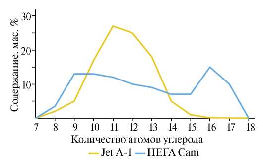 Авиационное топливо, получаемое из биосырья, по своему углеводородному составу значительно отличается от топлива, полученного из нефти. Например, авиакеросин марки Jet A-1 содержит преимущественно углеводороды С9– С14, с максимальным содержанием углеводородов С11 и С12 на уровне 25–27 мас.%. Топливная фракция, полученная при гидропереработке масла рыжика Camelina (HEFA Cam) представляет собой широкую фракцию углеводородов С8–С17, для которой характерно достаточно равномерное распределение компонентов – 7–12 мас.%; наибольшее содержание в данной фракции составляют углеводороды С16 – 15 мас.% (рис. 3) [2].