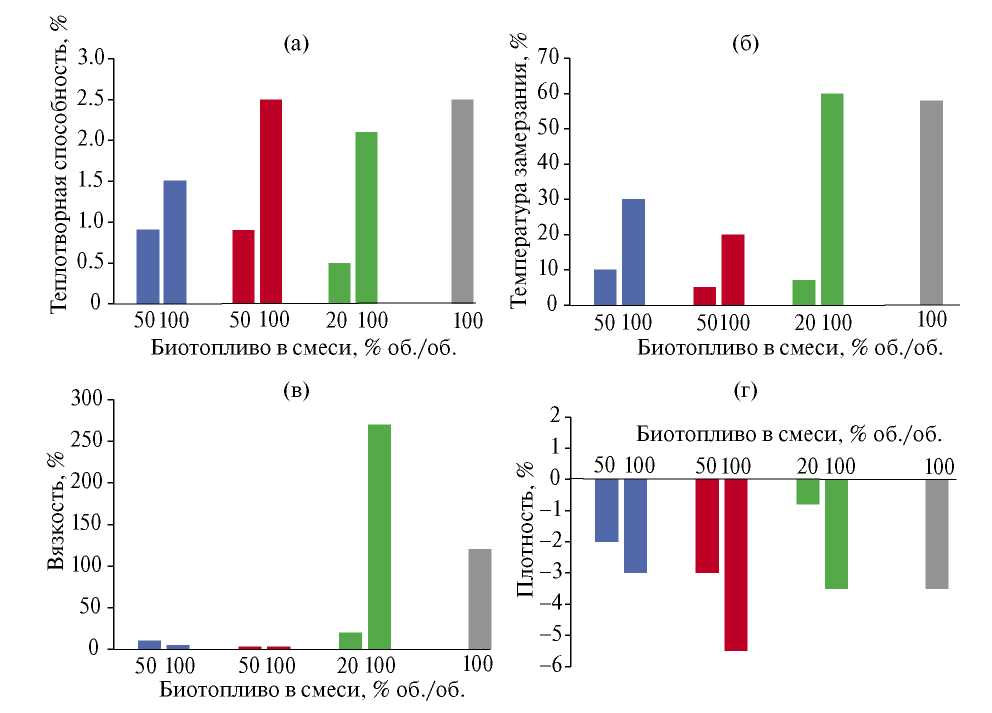 Исследование влияния содержания биотоплива на относительное изменение ряда физических свойств при смешении с нефтяным авиатопливом подробно представлено в работе [5]. В качестве объектов исследования использованы авиатоплива, получаемые по технологиям синтеза Фишера–Тропша, гидродеоксигенации триглицеридов жирных кислот, переработке сахаров и спиртов. Показано, что для 100%-ного авиатоплива, полученного в синтезе Фишера–Тропша, значение высоты некоптящего пламени такое же, как и для нефтяного топлива. Но их смешение при объемном соотношении 50%/50% приводит к значительному увеличению высоты некоптящего пламени на 80%. В то же время для 100%-ного топлива, полученного в процессе гидродеоксигенации жирных кислот и их эфиров, высота некоптящего пламени почти на 95% выше, чем для топлива нефтяного происхождения; однако их смешение при том же объемном соотношении приводит к снижению показателя на 75%. Использование авиатоплива, полученного из сахаров, по данному показателю также не отличается от нефтяного топлива, но при смешении в объемном соотношении 20%/80% происходит увеличение высоты некоптящего пламени на 10%. Аналогичные исследования проведены для теплотворной способности, температуры замерзания, вязкости, плотности (рис. 4 а–г). Показано, что данные величины не являются аддитивными и для смесей различного состава требуются индивидуальные исследования свойств.