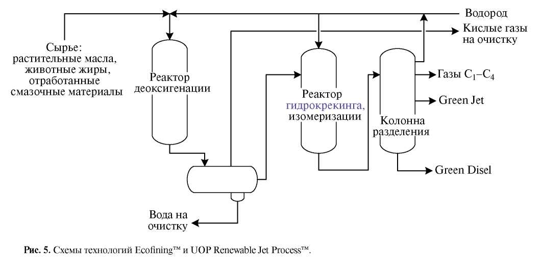 Для получения биотоплив в промышленности наиболее распространены технологии Ecofining™ и UOP Renewable Jet Process™ компании Honeywell UOP (США), а также технология NexBTL компании Neste (Финляндия). Технологии компании UOP реализованы на нефтеперерабатывающих заводах компаний Eni (Италия), Altair Fuels (США), Petrixo (ОАЭ), SG Preston (США), Total (Франция) и Petromina (Индонезия) и позволяют получать как биодизель, так и авиационное топливо, в то время как технология компании Neste ориентирована на получение только биодизеля 9 10 11 . Мощность заводов HEFA-jet составляет от 105 до 360 тыс. т/год [16]. Следует отметить, что разработки технологии получения биотоплив из отработанного кулинарного масла активно ведет компания Sinopec (Китай) [17, 18]. В аппаратурном оформлении технологии Ecofining™ и UOP Renewable Jet Process™ не отличаются: реактор изомеризации для первой технологии используется как реактор гидрокрекинга и изомеризации для второй (см. рис. 5).
