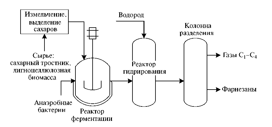 Процесс DSHC-конверсии сахаров направлен на получение алканов в процессе анаэробной ферментации сахаров без получения спиртов в качестве промежуточного продукта. Технология Biofene™, разработанная компаниями Amyris и Total для получения изопреноида фарнезенов, использует в качестве сырья сахарный тростник. Фарнезен на втором этапе процесса гидрируют с получением фарнезанов – компонента авиационного топлива. Промышленное производство фарнезенов мощностью 40 тыс. т/год реализовано в 2013 г. в г. Бротас (штат Сан-Паулу, Бразилия) [29]. Главным элементом технологии Biofene™ является штамм, который подходит для микробной ферментации и может расщеплять как шестиуглеродные (глюкозу, галактозу и маннозу), так и пятиуглеродные сахара (ксилозу и арабинозу). В технологии Biofene™ использованы не содержащие ГМО штаммы S. cerevisiae компании Microbiogen (Австралия) (рис. 9).