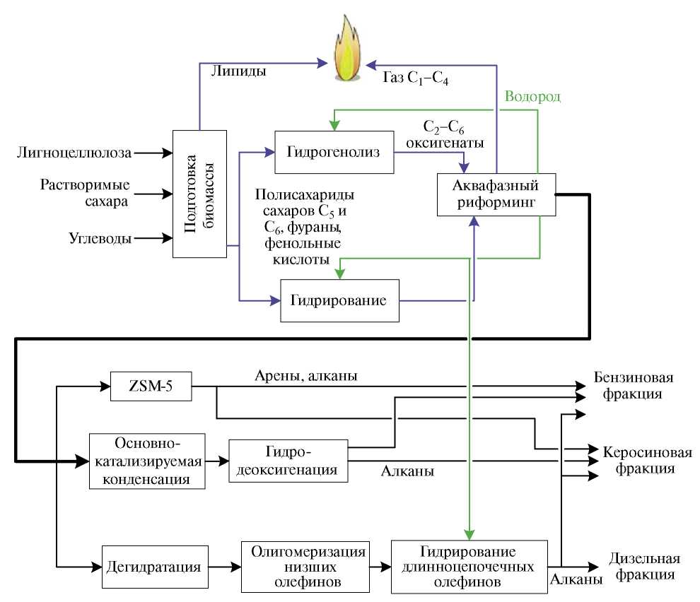 Технологии получения топлив из биосырья могут быть основаны на процессе гидрирования (гидродеоксигинации) триглицеридов жирных кислот и их эфиров – Hydroprocessed Ethers and Fat Acids (HEFA); на процессе газификации биомассы с получением синтез-газа и его дальнейшей конверсии в углеводороды по методу Фишера–Тропша (Fischer–Tropsch, FT); на процессе ферментации сахарной биомассы с получением фарнезенов с последующим их гидрированием в алканы – Direct Sugars to Hydrocarbons (DSHC); на процессе ферментации биомассы с получением спиртов и последующей их конверсией в низшие олефины и жидкие углеводороды – Alcohol to Jet (ATJ); на процессе пиролиза с получением бионефти и ее разделением методом ректификации – Hydrotreated Depolymerized Cellulosic Jet (HDCJ). Для некоторых видов сырья, например лигноцеллюлозы (ЛЦ), возможно несколько вариантов переработки с получением продуктов различного состава. Общая схема переработки биомассы различного происхождения представлена на рис. 2.