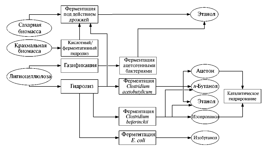 Рис. 11. Синтез этанола, изопропанола и бутанолов из биомассы при ферментативном брожении.