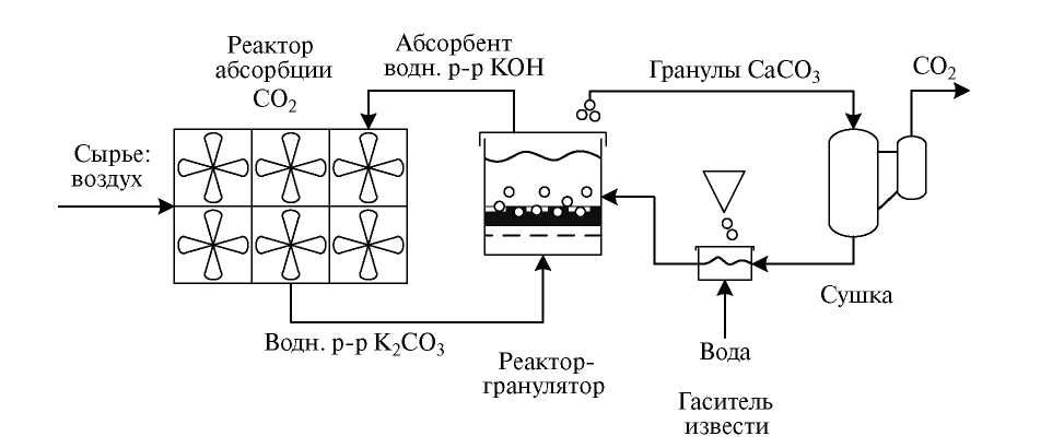 Источником СО2 является воздух. Технология получения СО2 из воздуха (Direct Air Capture) разработана компанией Carbon Engineering (Канада)21. Технология улавливания СО2 из воздуха включает в себя три основные стадии: улавливание СО2 с помощью абсорбента, регенерацию абсорбента, прокалку осадка и высвобождение СО2. На первой стадии вентилятор втягивает воздух в воздушный контактор, сконструированный по образцу градирни. Воздух проходит через тонкие пластины, по которым стекает абсорбент – водный раствор гидроксида калия. В результате химического взаимодействия СО2 и КОН образуется карбонат калия. Далее насыщенный раствор абсорбента К2СО3 подают в реактор-гранулятор; туда же подают насыщенный раствор гидроксида кальция. В результате взаимодействия происходит регенерация абсорбента и образование осадка в виде карбоната кальция. Регенерированный абсорбент в виде КОН направляют на стадию улавливания СО2 в воздушном контакторе. Карбонат кальция представляет собой гранулы, которые направляют на прокалку, чтобы высвободить СО2. Образующийся при этом в системе оксид кальция смешивают с водой в известь-гасителе и подают обратно в реактор-гранулятор (рис. 12).