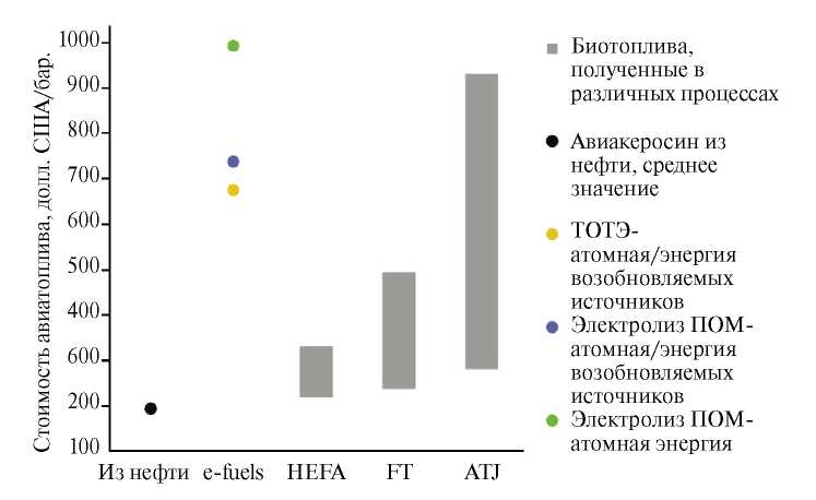 Для нефтяного авиатоплива выбросы СО2 составляют 90–110 г CO2-экв/МДж получаемого топлива. Оценка существующих технологий производства биотоплив показывает, что выбросы CO2 при их производстве варьируются в зависимости от сырья и составляют в синтезе Фишера–Тропша 3.6–22 г(CO2-экв)/МДж, в технологии HEFA – 16.5–47 г(CO2-экв)/МДж, в технологии DSCH – 15–80 г(CO2-экв)/МДж, ATJ –1.6–89.8 г(CO2-экв)/МДж. [42, 43, 44].