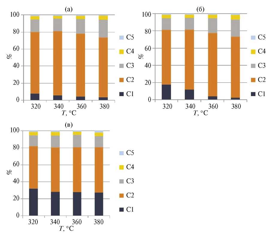 Рис. 5. Влияние температуры синтеза на состав одноатомных алифатических спиртов, образующихся в присутствии композитных катализаторов Fe-ПВС-250 (а), Fe-ПВС-350 (б) и Fe-ПВС-500 (в).