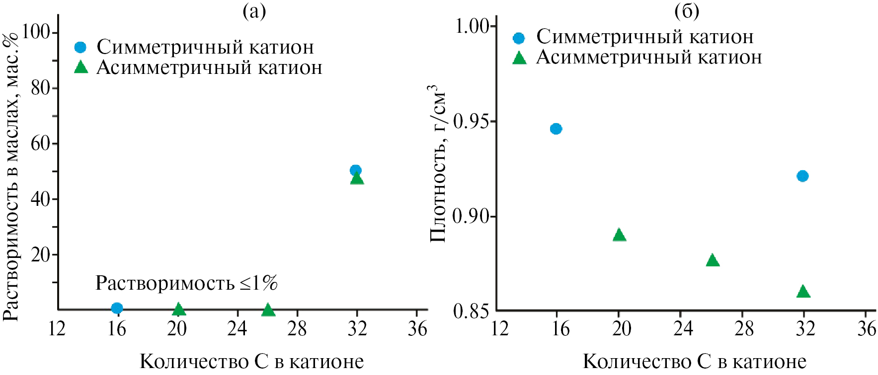 В работах [16, 35–37] рассматриваются следующие вопросы: сравнение алкиламмониевых катионных ИЖ с галогенсодержащими ИЖ, влияние длины алкильного радикала катиона на антифрикционные и противоизносные свойства, растворимость в базовых маслах. При увеличении длины алкильного радикала в катионе наблюдалось улучшение антифрикционных и противоизносных свойств масел, для аниона наблюдалась обратная зависимость. Алкиламмониевые катионные ИЖ показали также более высокие антифрикционные и противоизносные свойства по сравнению с галогенсодержащими ИЖ, но, к сожалению, большинство алкиламмониевых жидкостей плохо растворяются в неполярных маслах.