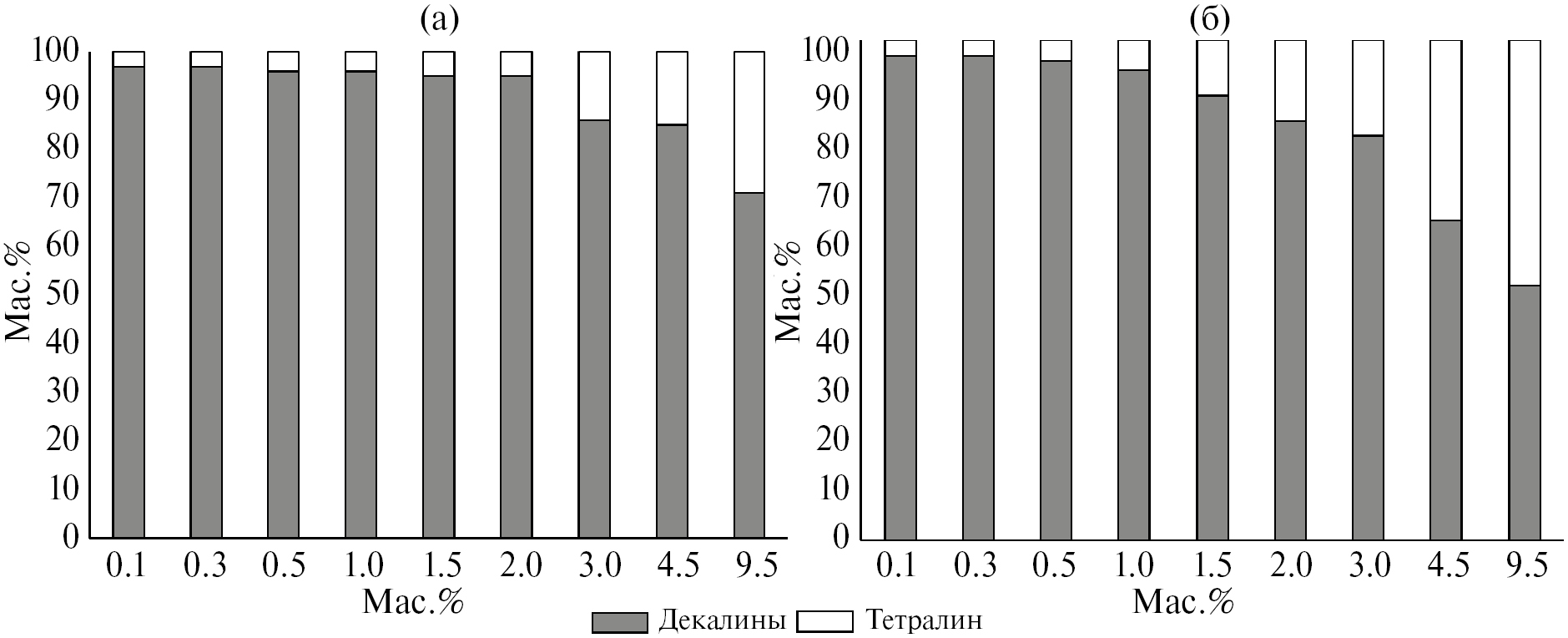 Гидрогенизационные процессы переработки как традиционного углеводородного сырья, так и альтернативных источников углеводородов предполагают протекание сразу нескольких процессов, потому исследование превращения смесей различных тестовых субстратов обосновано. Увеличении количества вводимого пиридина в реакционную смесь от 0.1 до 1 мас.% практически не влияет на долю декалинов в продуктах (рис. 1а, б) независимо от количества вводимой элементной серы, доля декалинов составляет 94–97 мас.%. Более существенное снижение содержания продуктов полного гидрирования нафталина до 86 (рис. 1а) и 84 мас.% (рис. 1б) наблюдали при введении 3 и 2 мас.% пиридина соответственно. Наибольшее снижение гидрирующей активности (51 мас.% декалинов) наблюдали при максимально введенном количестве пиридина (9 мас.%) в систему (рис. 1б).