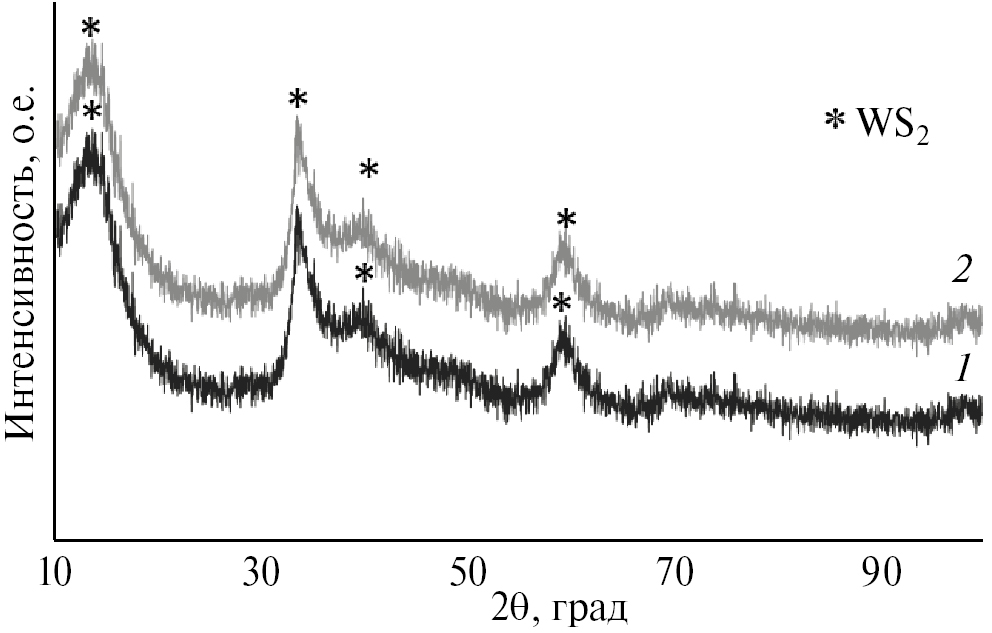Рис. 3. Дифрактограммы образцов катализаторов, сформированных in situ (380°C, 5.0 МПа Н2, 5 ч, 7.3×10–5 моль Ni, 1.5×10–4 моль W, нафталин/пиридин = 3/1 мольн.): 1 — NiW_4; 2 — NiW_10.