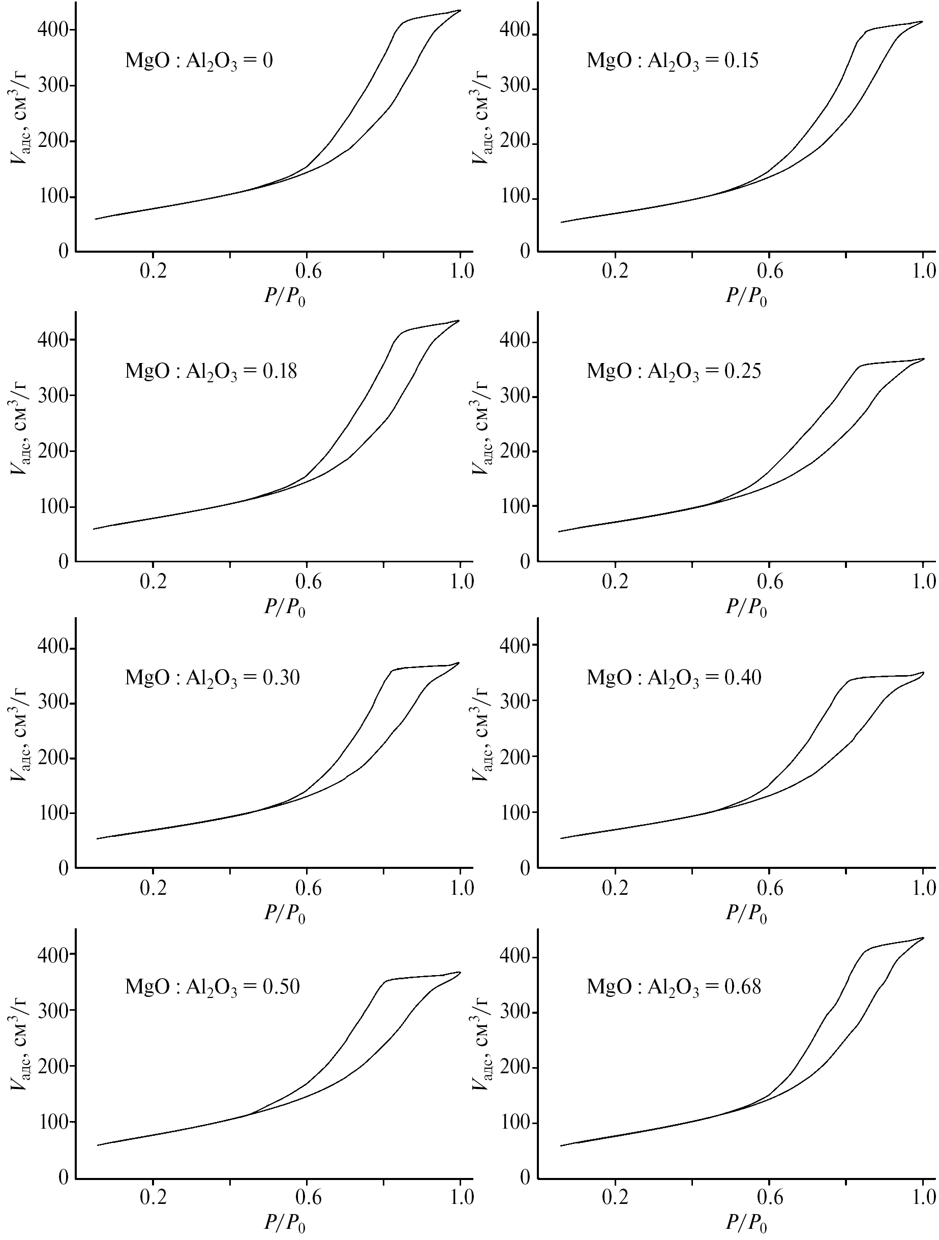 Рис. 1. Изотермы низкотемпературной адсорбции–десорбции азота при 77 К Na–MgAl-катализаторов.