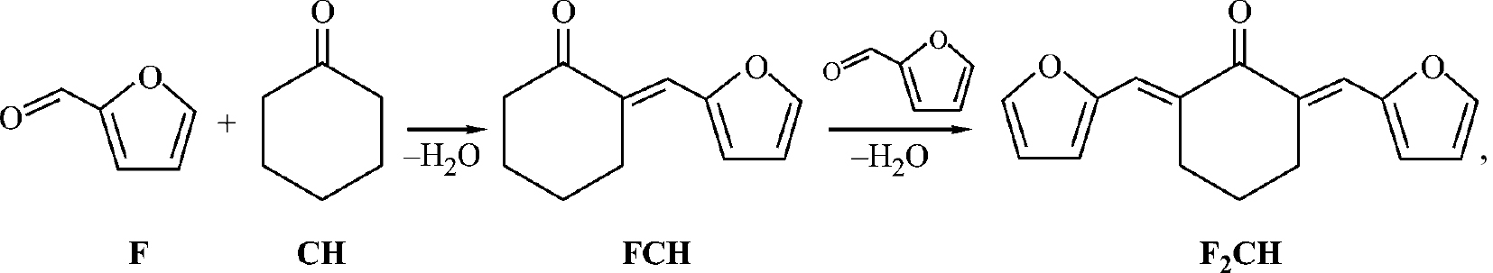 где F — фурфурол, CH — циклогексанон, FCH — 2-(2-фурфурилиден)циклогексан-1-он, F2CH — 2,6-(дифурфурилиден)циклогексанон.