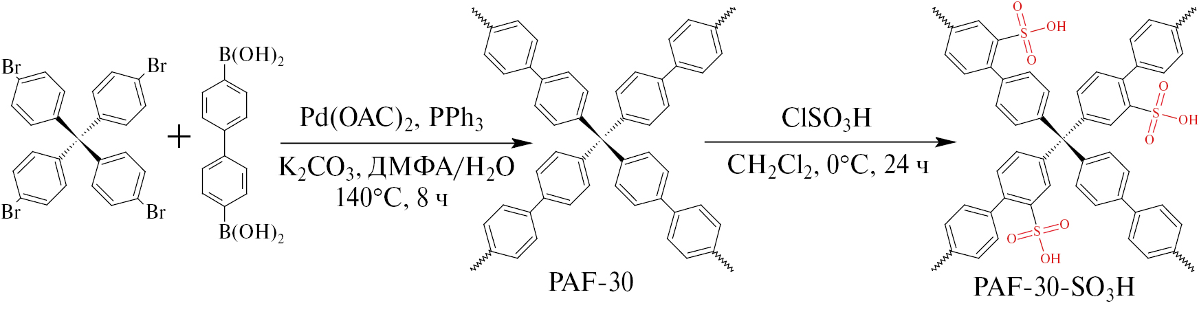 PAF-30 был синтезирован с использованием метода, описанного ранее [25, 27]. PAF-30-SO3H получали путем сульфирования каркаса PAF-30 хлорсульфоновой кислотой (схема 1) [18, 22]. Согласно данным элементного анализа, содержание серы в материале составляет 5.21 мас.%.