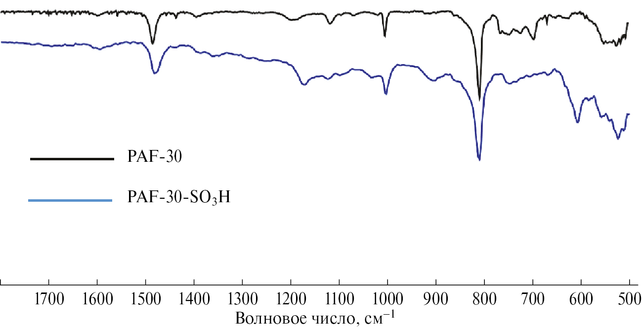 Спектры FTIR сульфированных материалов (рис. 1) содержат полосы поглощения при 610, 900, 1035, 1124–1220 и 1370 см–1, характерные для сульфогрупп [28]. Полосы при 1170 и 1290 см–1 соответствуют симметричным и асимметричным валентным колебаниям фрагмента O=S=O соответственно, а сигнал при 1035 см–1 можно отнести к валентным колебаниям S–O [29]. Полоса поглощения при 1090 см–1 относится к колебаниям связей C–S бензольного кольца каркаса, замещенного сульфогруппами, тогда как пик при 610 см–1 соответствует его валентной моде [30]. По данным кислотно-основного титрования кислотность сульфированных PAF составляет 1.4 ммоль г–1.